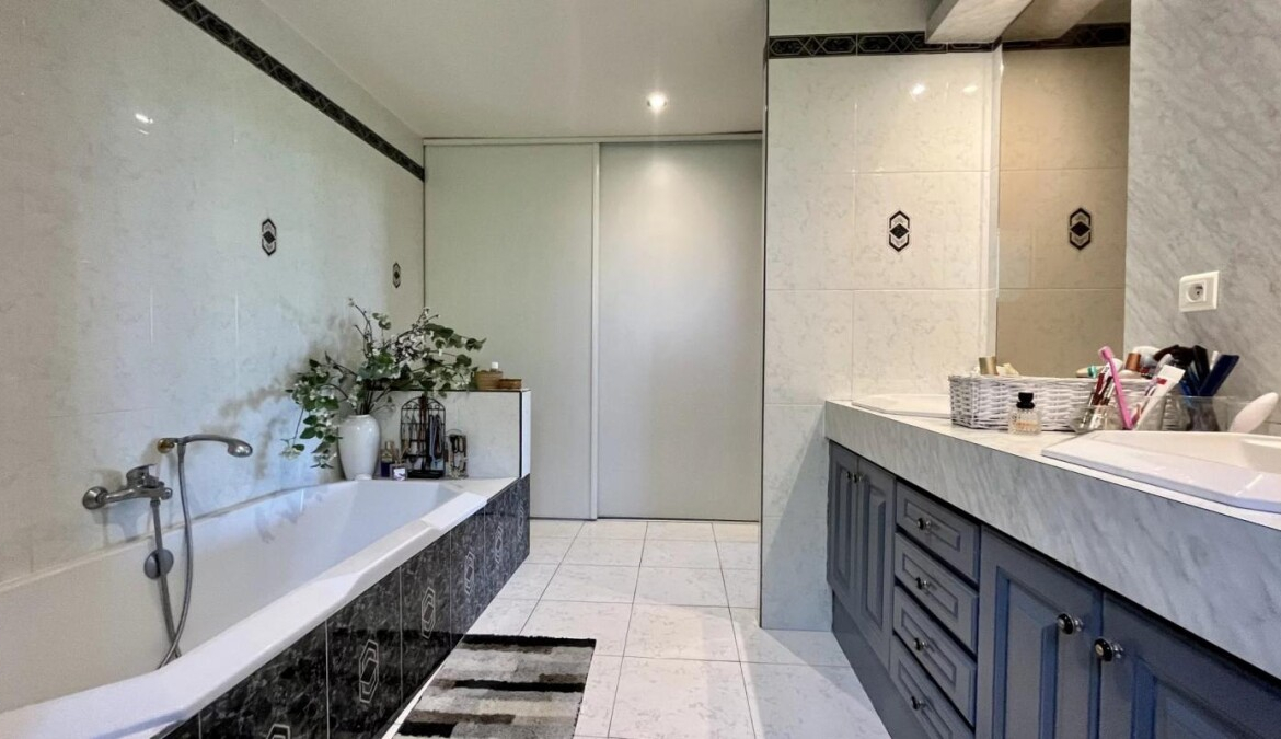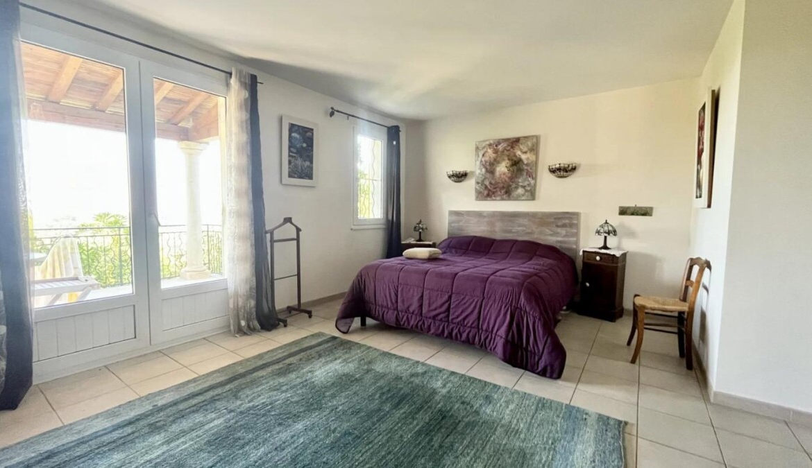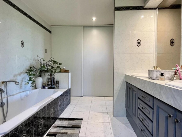 The villa comprises four spacious suites, an office, and a large open-plan living area that flows into the kitchen and opens onto the panoramic terrace. These spaces offer a bright and welcoming atmosphere. This property boasts high-quality features: heat pump, thermodynamic water heater, double glazing, photovoltaic panels, etc., with an impeccable energy performance certificate (DPE) rating of A.