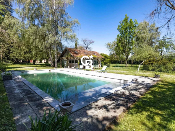 The whole has a beautiful view of the mountains and is shared by a beautiful interior courtyard decorated with fountains and a magnificent fleet of 15,000 m² enclosed and protected by hundred -year -old trees, a vegetable patch and a swimming pool.