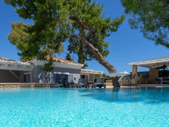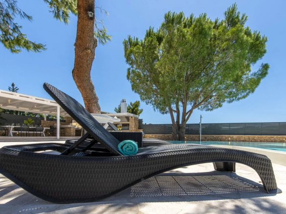 dining areas, a lounge area, a sparkling private infinity pool with numerous sun loungers