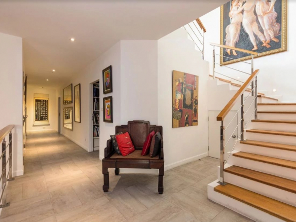 The lower floor comprises a large entrance hall, as well as three further bedrooms with en-suite bathrooms, a library, maid's and laundry rooms, and spacious storage rooms. Each bedroom opens onto a small private garden terrace with views of the greenery and the sea.