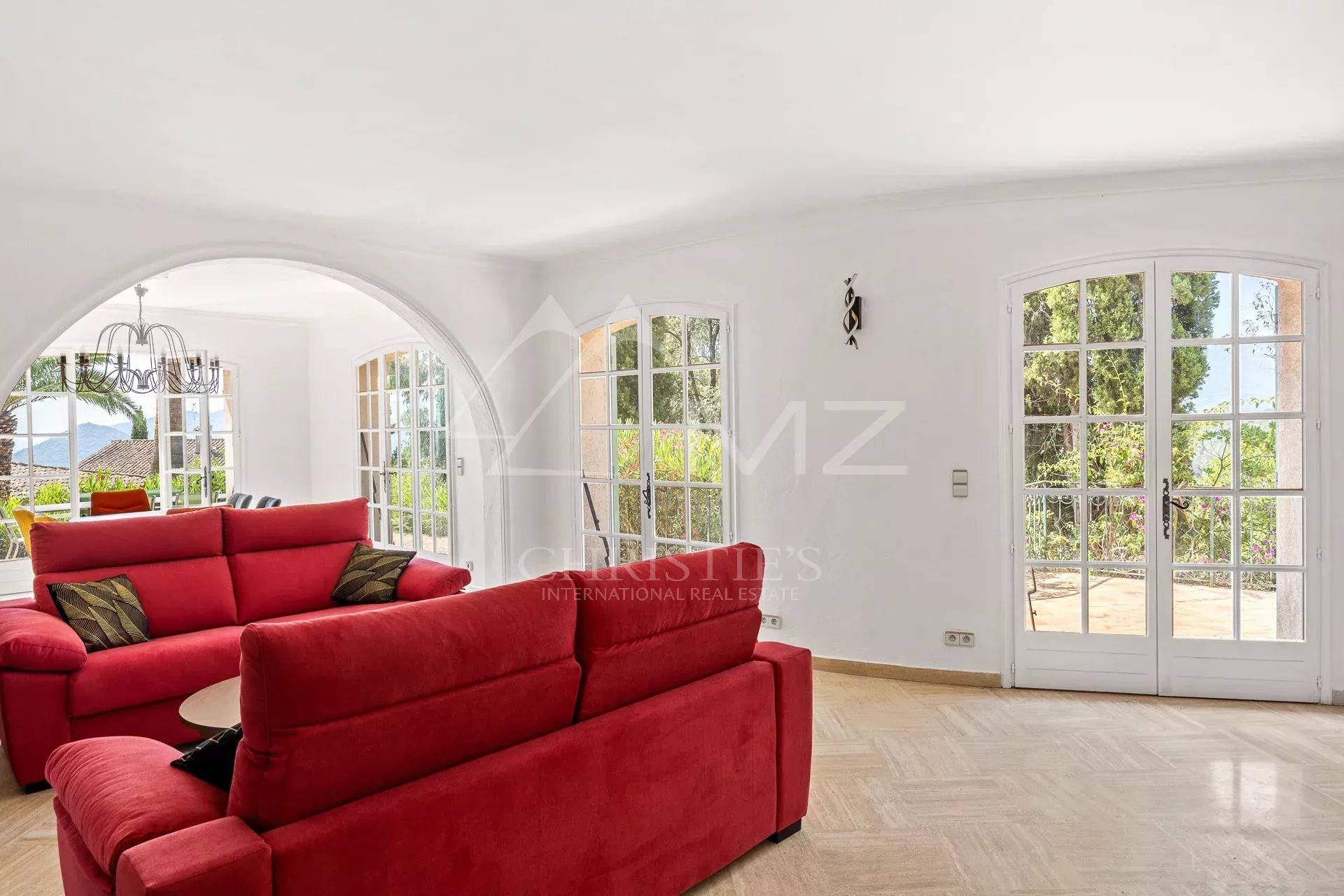 On the Termes hillside, in a commanding position and nestled in lush greenery, this south-facing family property, ripe for renovation, spans three levels and comprises a spacious living area with a lounge/dining room, a kitchen with a utility room, four bedrooms including a master suite with bathroom and dressing room, a separate two-room space ready for conversion, attractive terraces, a private pool area, and a double garage. Located 5 minutes from the center of Mandelieu, 20 minutes from the Croisette, and 30 minutes from Nice International Airport.