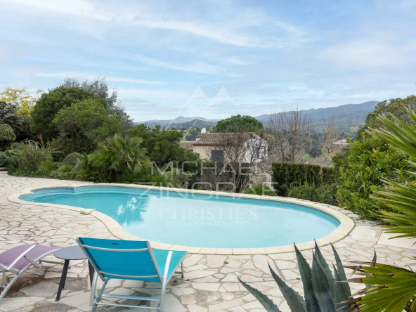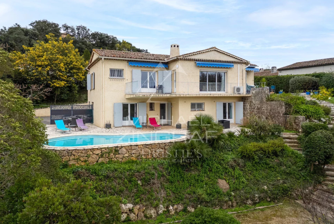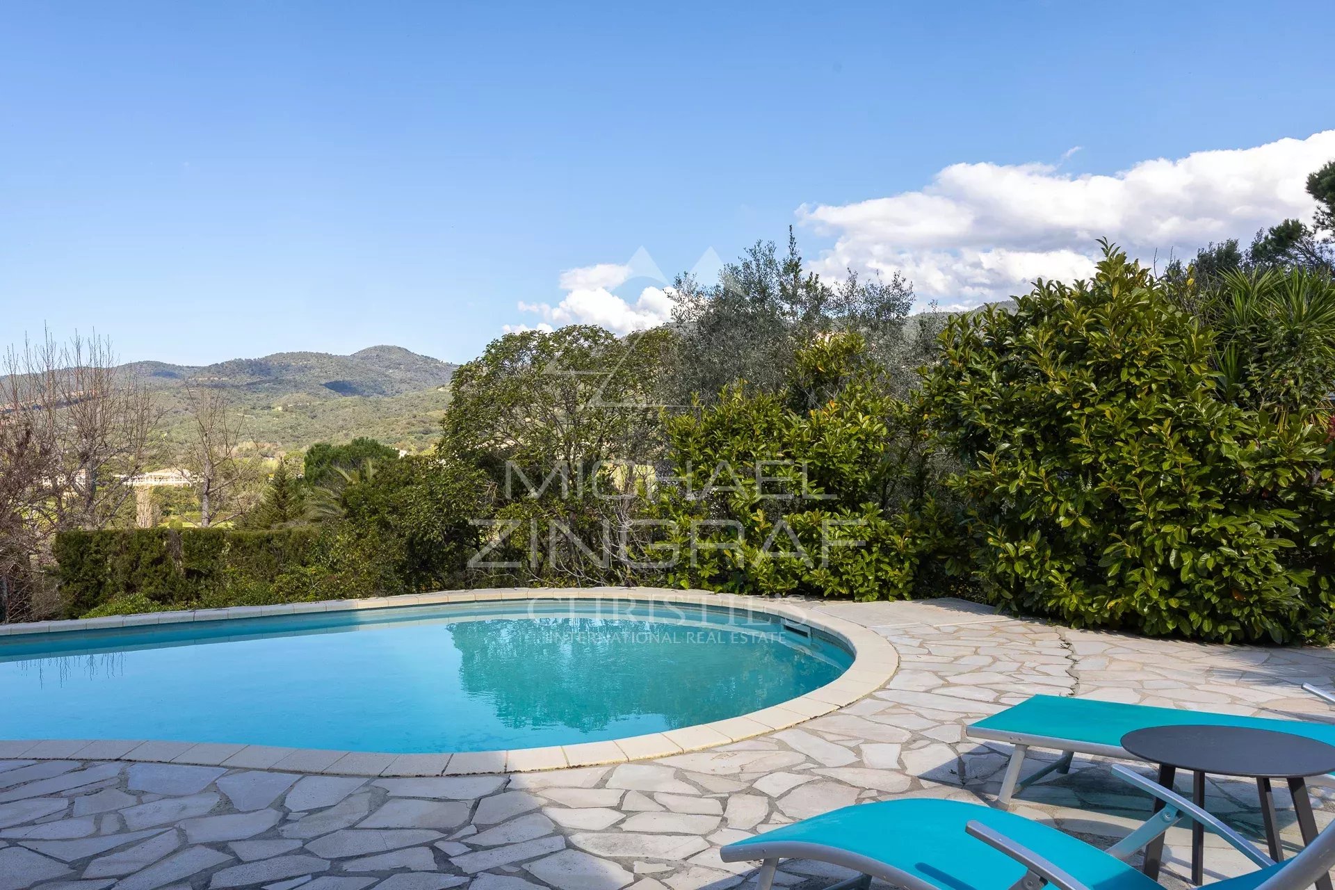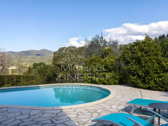 In a prized and calm district of Mandelieu, in a dominant position, this elegant renovated family home offers a breathtaking view of the mountain and golf.