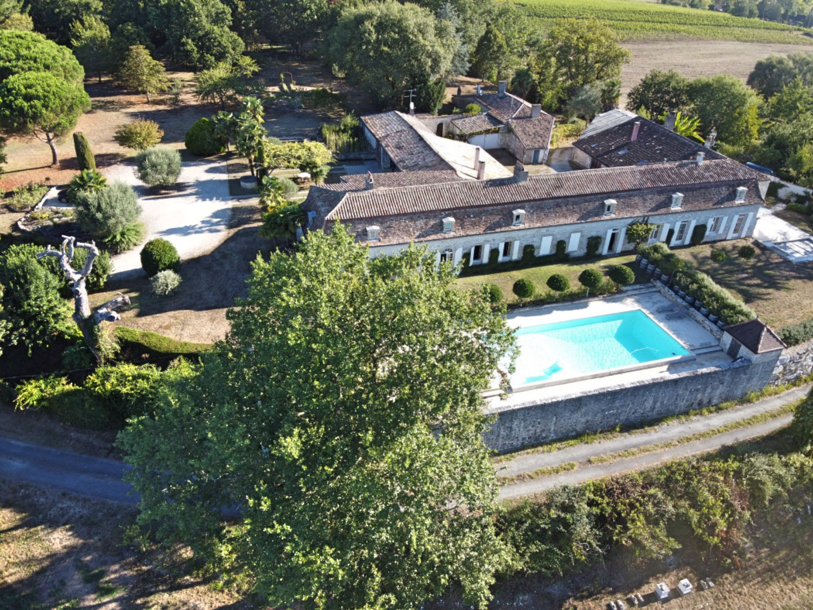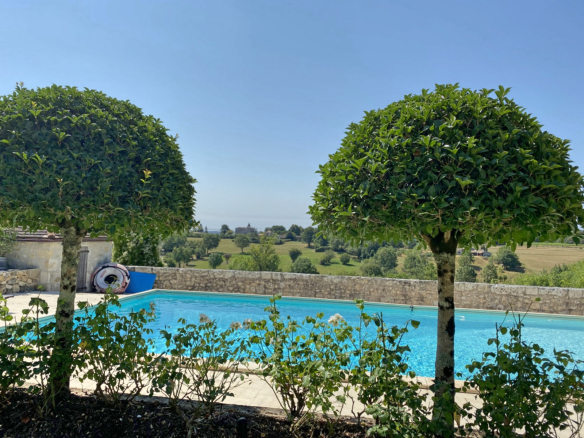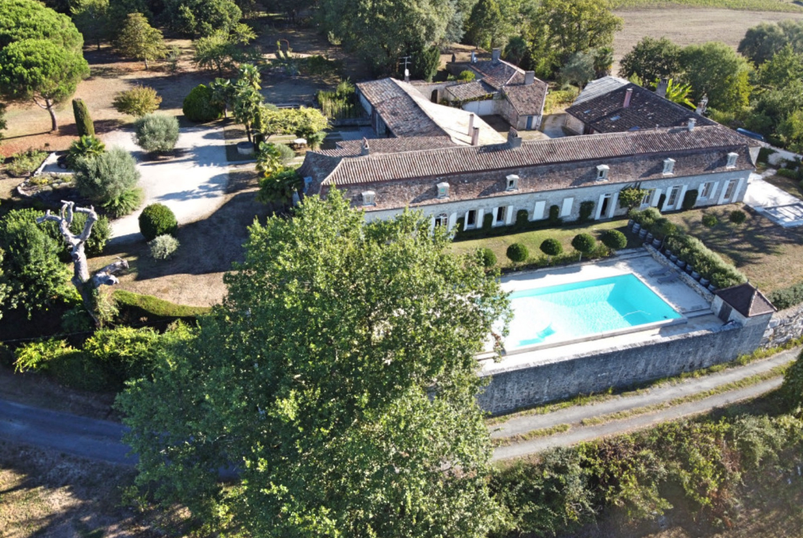 Perched on a hill with unobstructed views, this peaceful and beautiful country house boasts a park and grounds (11 hectares), an adjoining guest house, a third house to renovate, two swimming pools, and high-end amenities. Original features have been preserved, including Gironde tiles, fireplaces, and exposed beams.