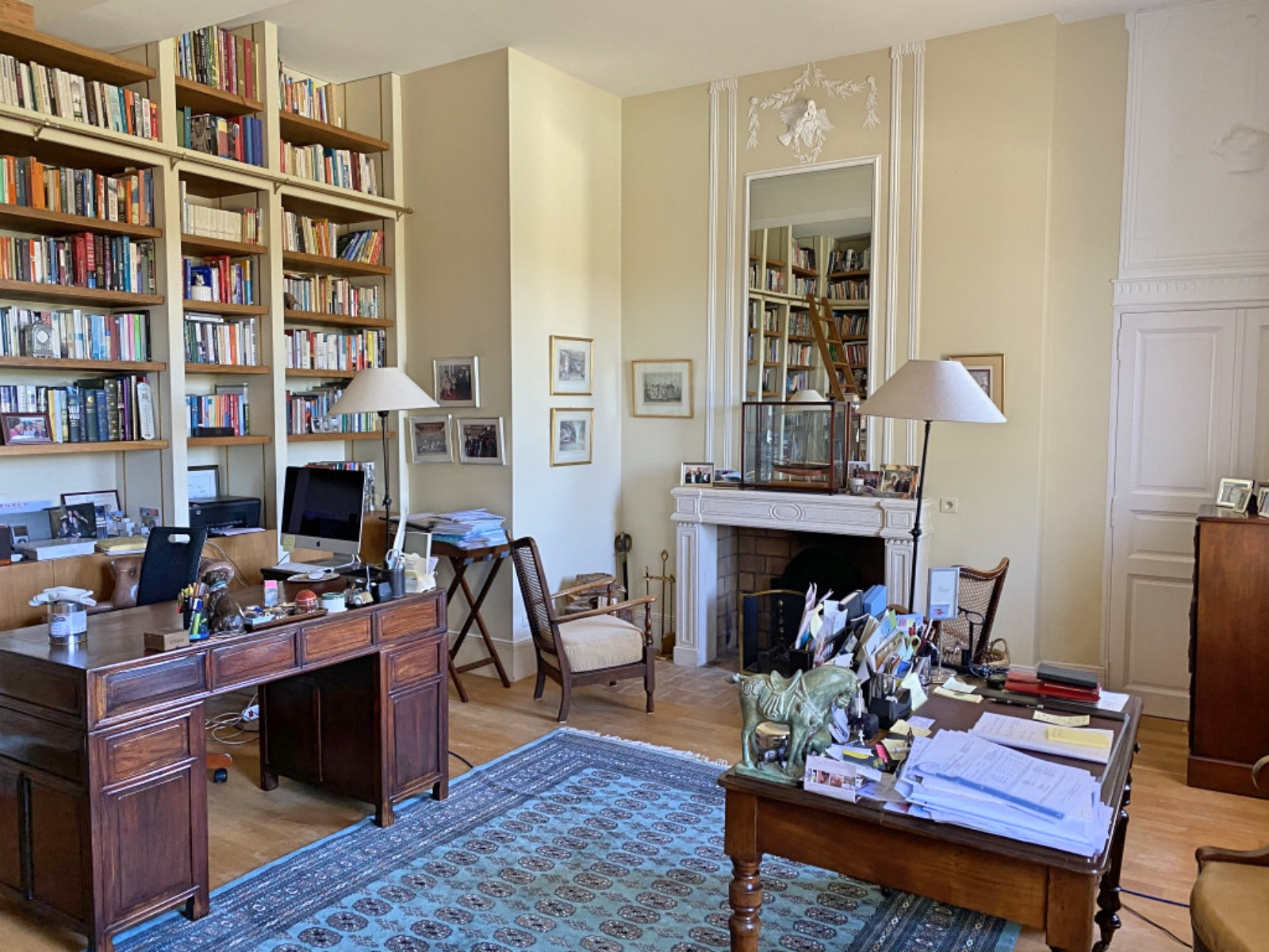 a large 45 sq m living room with a fireplace and antique doors,