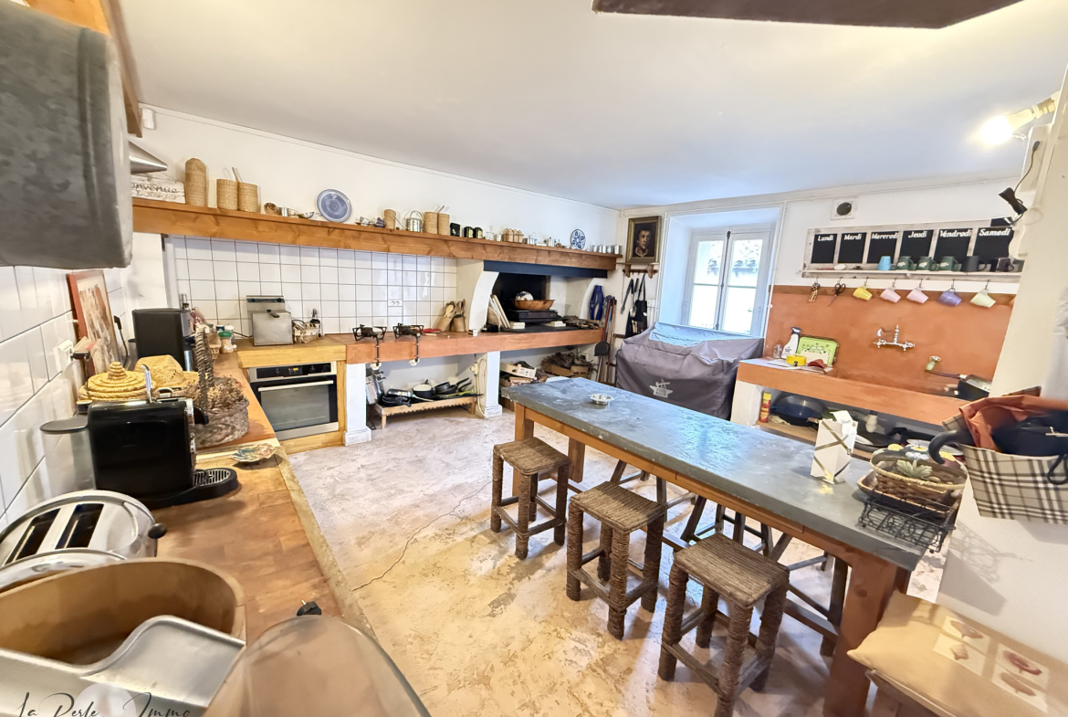 A separate kitchen with a professional cooking range with rotisserie and a back kitchen,