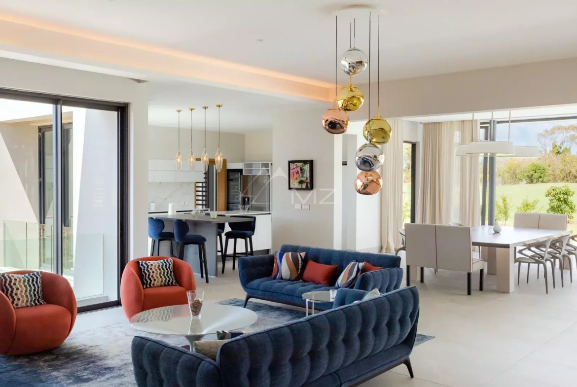 Contemporary villa of 726m2 with 5 bedrooms, located on a plot of 2112m2 offering a panoramic view of the golf course with clear and distant views towards the mountains, west / setting sun orientation.