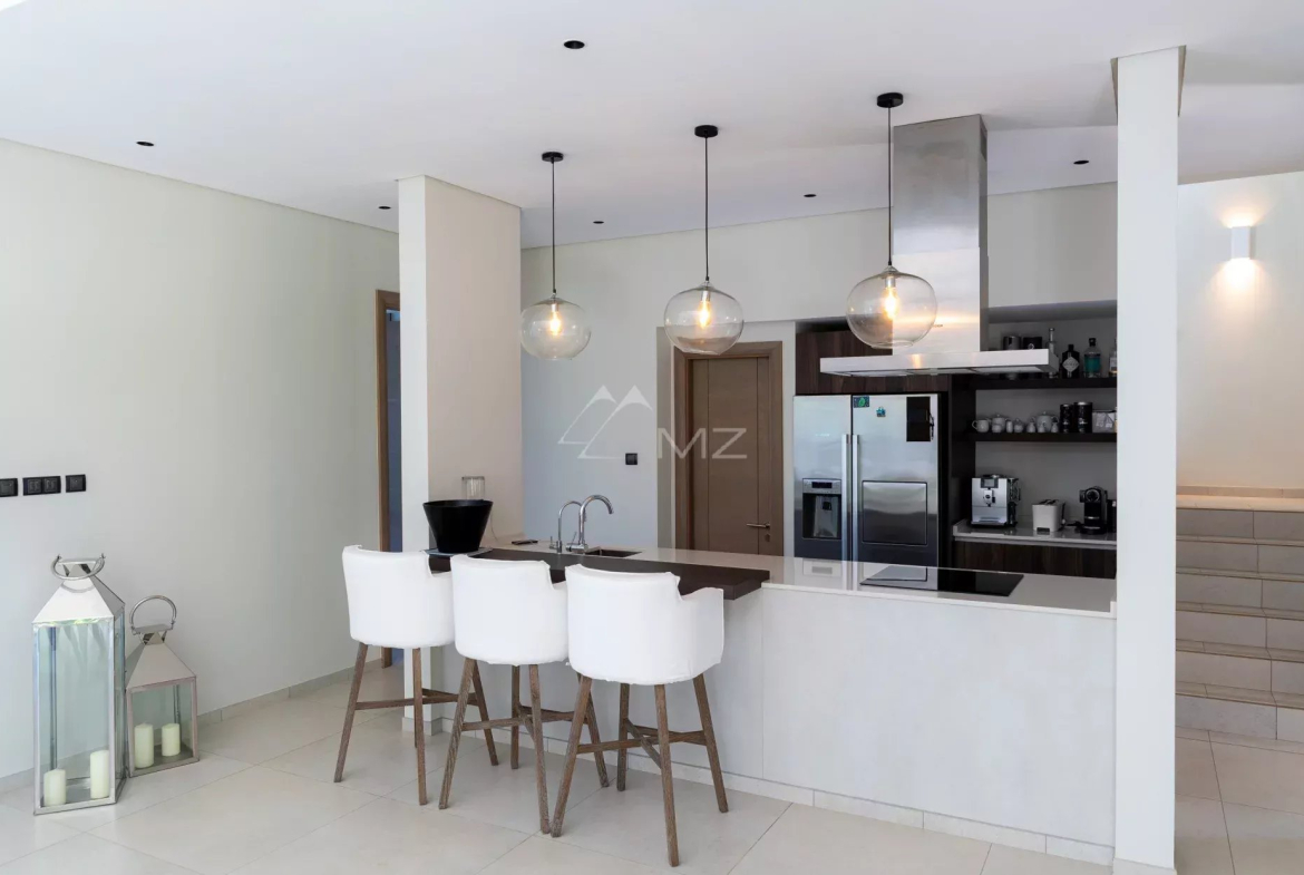 Nestled in the heart of the internationally renowned golf course, this neighborhood offers a living environment marked by serenity. Your luxury villa, on freehold land, will offer you a view of the fairways designed by the legend Ernie Els and the Bambou mountain range. This very recent 304 m2 villa has 4 bedrooms with en-suite bathrooms. Located on the edge of the golf course, it offers magnificent views of the course and the lagoon facing it. Built on a shared plot of 2,243 m2, this semi-detached villa with remarkable ceiling heights offers very bright living spaces, including a large living-dining room with American kitchen which open onto a beautiful terrace and a wide-open swimming pool. dimensions. It also has a roof terrace with panoramic views to share superb moments of conviviality with family or friends.