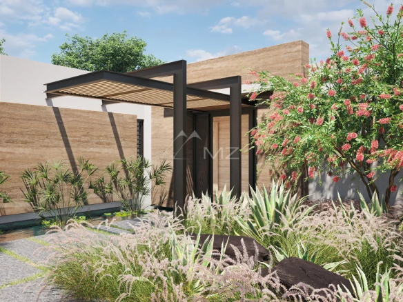 The layout of these villas includes vertical movable screens on the south facade to block the prevailing winds, as well as a more spacious interior patio, offering the possibility of adding a swimming pool. Three en-suite bedrooms are offered (a fourth is available as an option), and the living space is designed as a large, welcoming open-plan area combining a kitchen, a spacious living room, and a dining room.