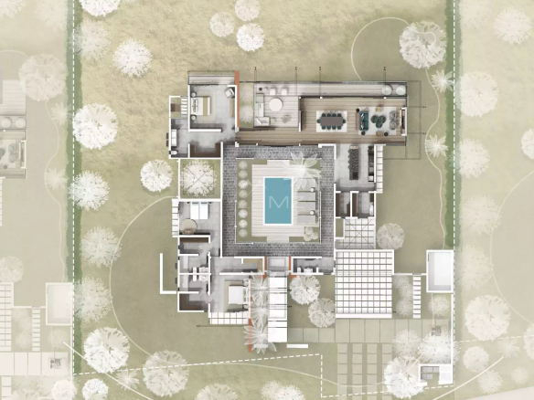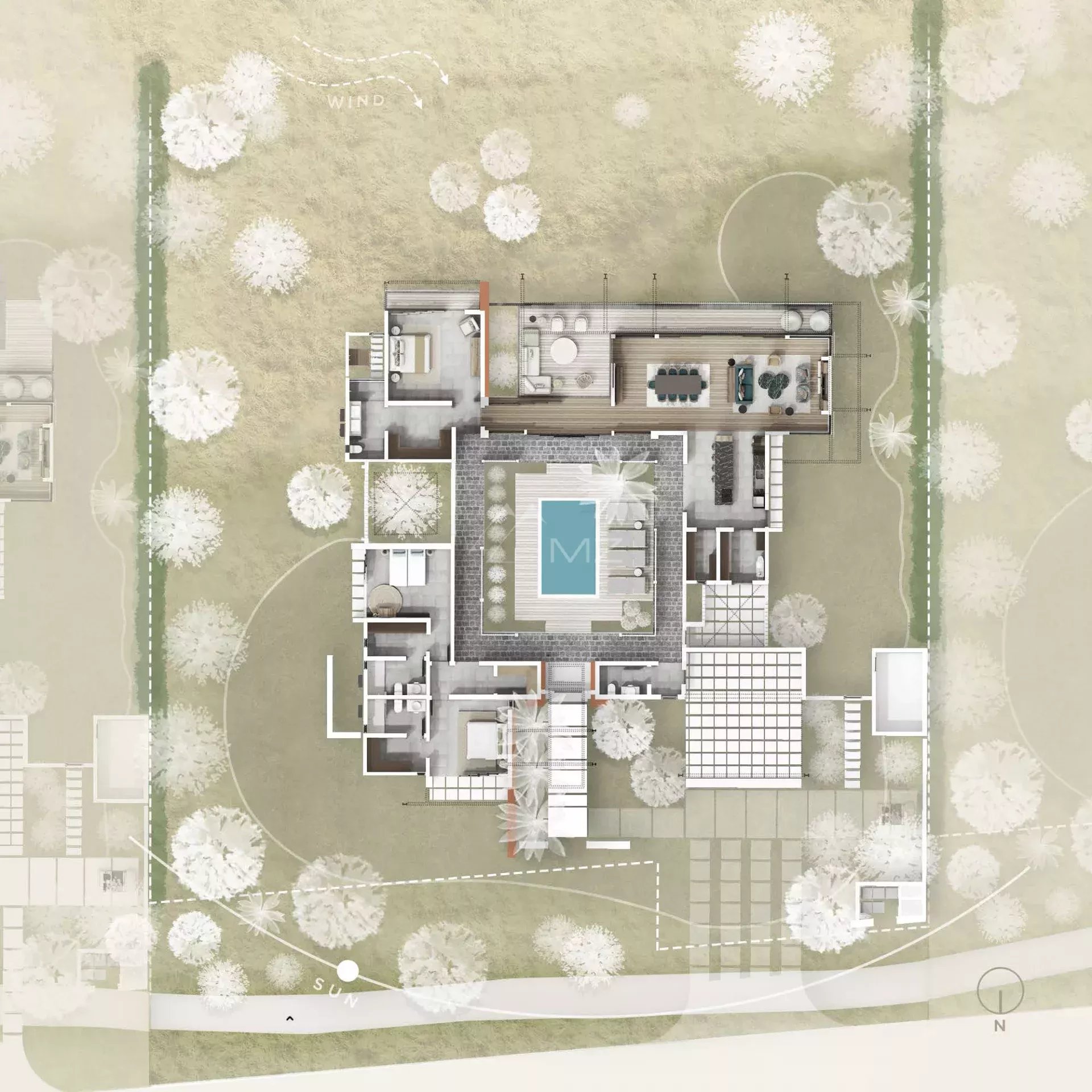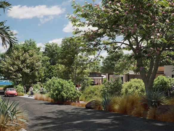 The site benefits from a unique savanna atmosphere. Its climate is very dry, and its current landscapes are composed of a combination of tall Black River grasses, endemic trees, blackwood trees, tamarind trees, Creole agaves, and volcanic rocks. The landscaping concept aims to preserve the site's beauty by reusing 100% of the existing plants for the roadside verges and by landscaping 90% of the area around each villa with existing plants and endemic plants of Mauritius