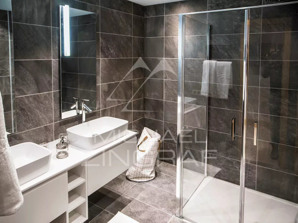 Michaël Zingraf Real Estate Megève presents this 98.57 sq m (Carrez Law) apartment, comprising a spacious open-plan living/dining room with a fully equipped kitchen, two bedrooms each with its own dressing room, walk-in shower, and toilet. A guest toilet with a washbasin is located off the entrance. Four large balconies provide ample space for enjoying time outdoors.