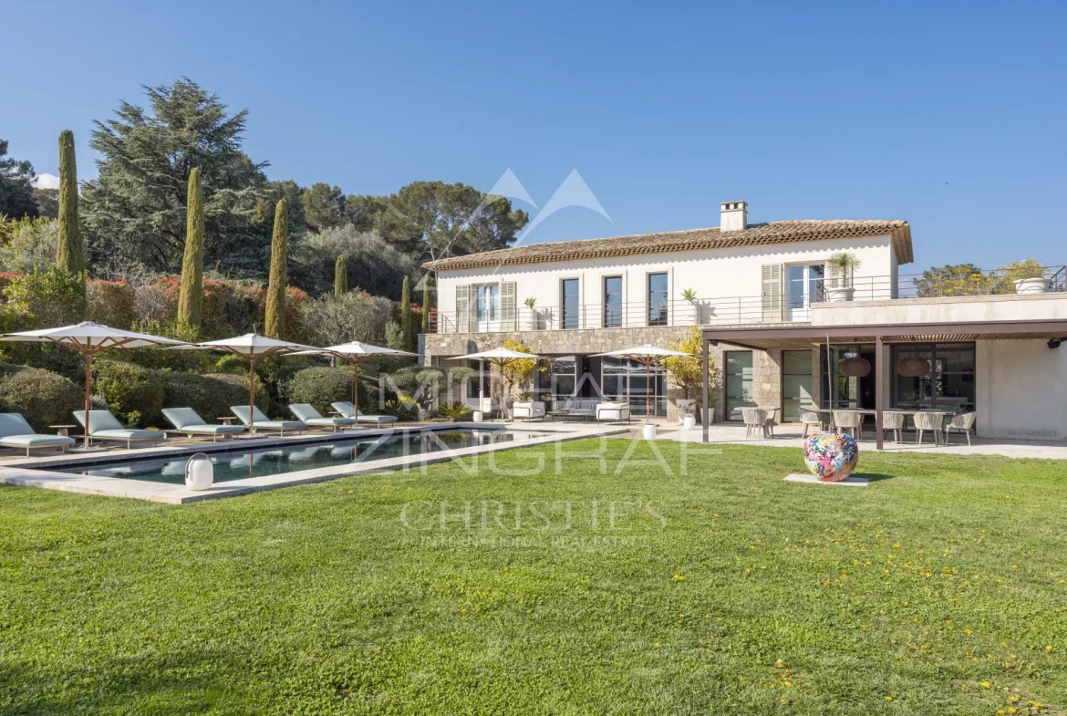 Co-exclusive listing: Nestled within a highly private, gated community, close to Cannes yet enjoying a tranquil setting, this superb property captivates with its elegance and authenticity. Ideally situated on the edge of the forest, it benefits from a privileged lifestyle, perfect for walking or cycling.