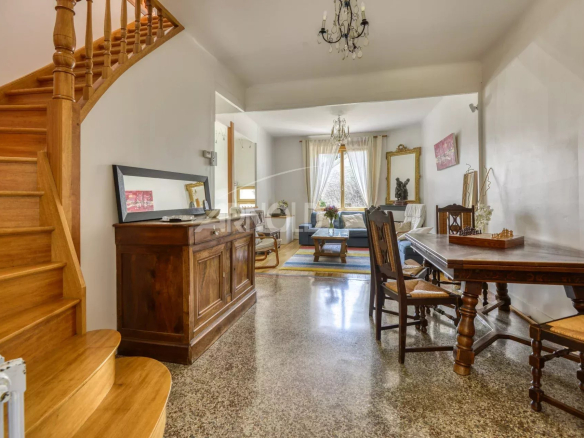 The mezzanine level, with its own separate entrance and measuring approximately 58m², formerly a doctor's office, offers the potential to create additional living spaces, a gym, a games room, a music room, one or two rental units, or offices for a professional practice. It comprises two rooms, one of which is 27m², a kitchen area, a shower room with toilet, a separate toilet, and a patio.