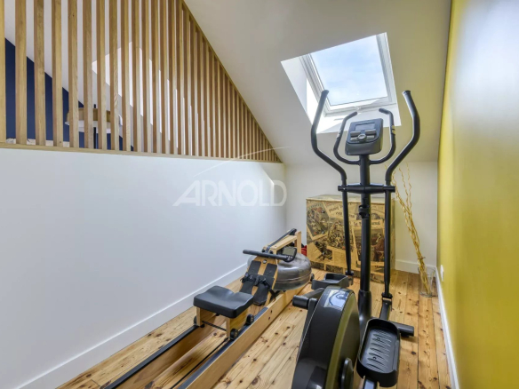 The second level offers a bedroom, a living room or office, and a room currently used as a gym. This floor offers excellent flexibility with the possibility of creating a third bedroom.