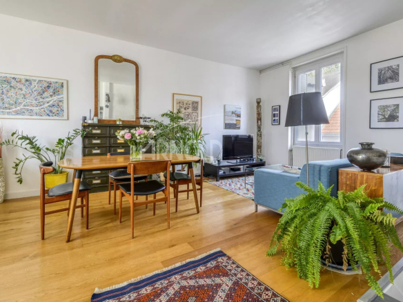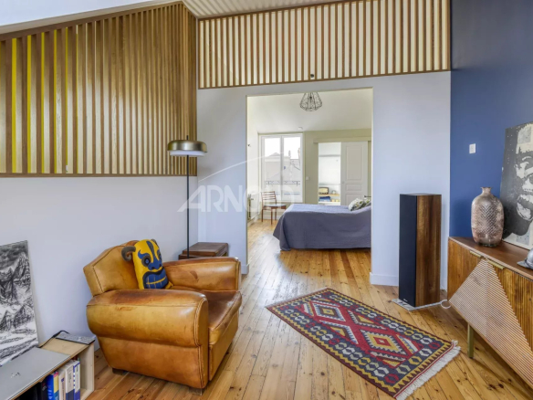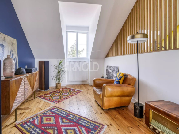 The ground floor opens onto a beautiful living room bathed in light thanks to its southwest exposure, adorned with elegant parquet flooring.