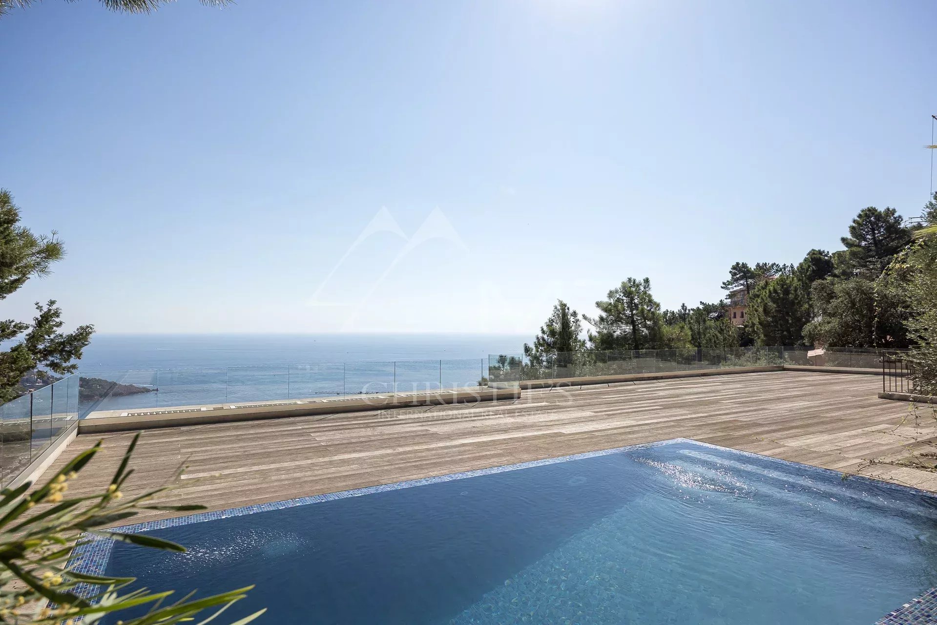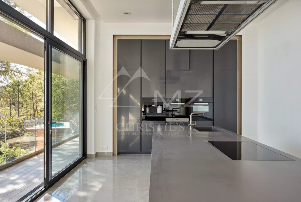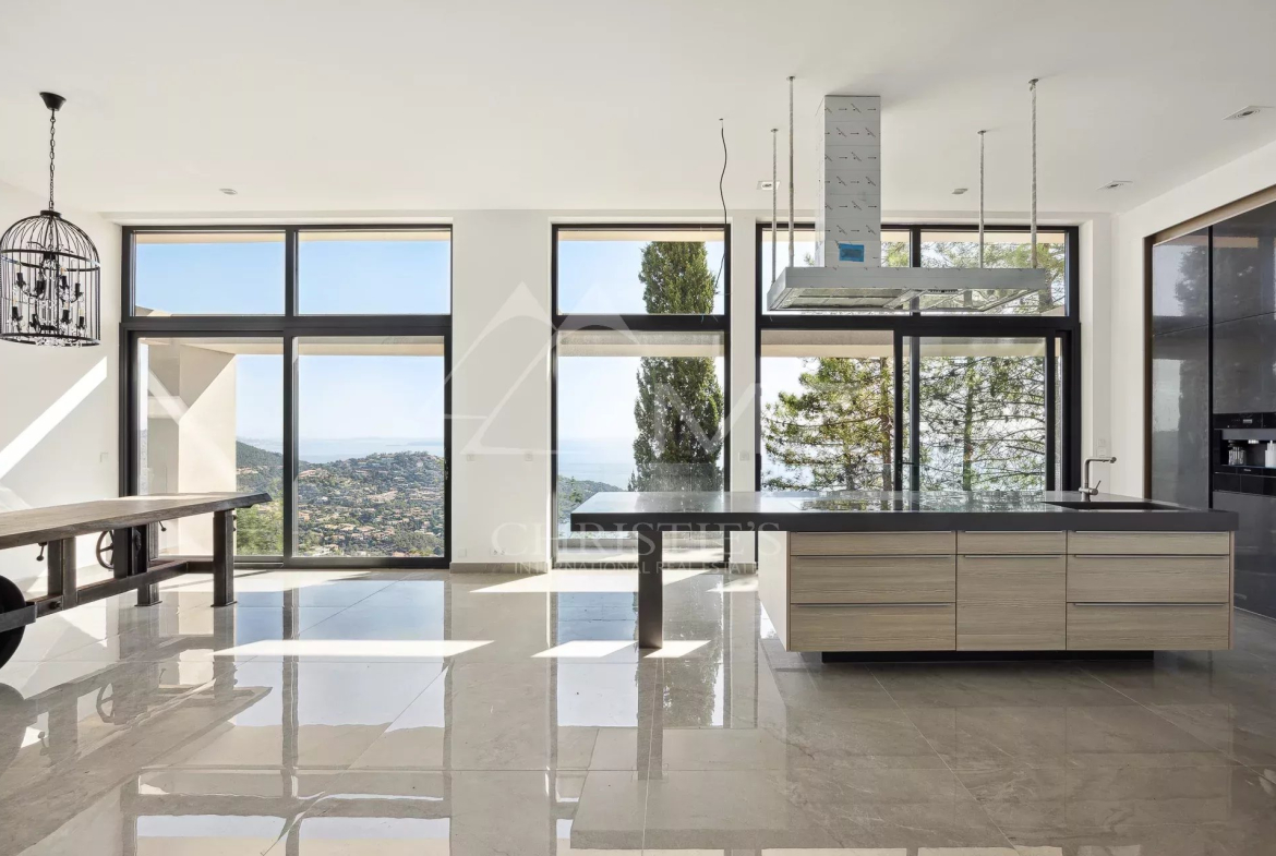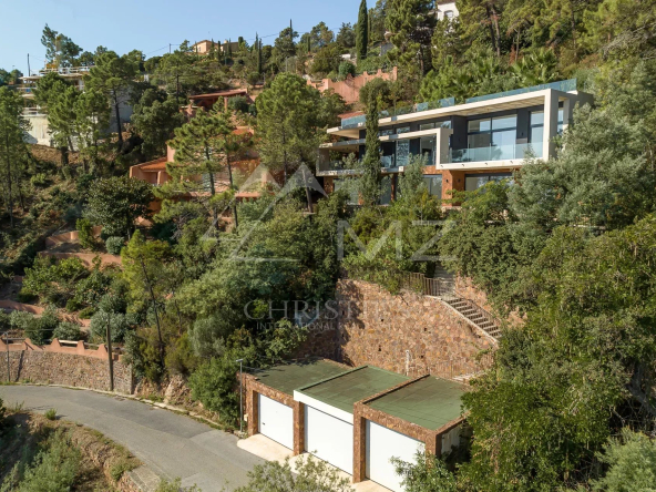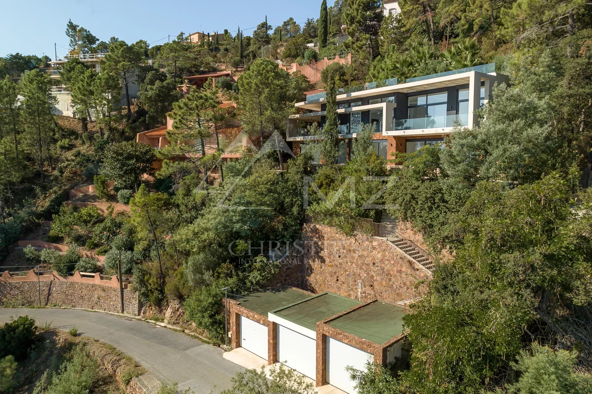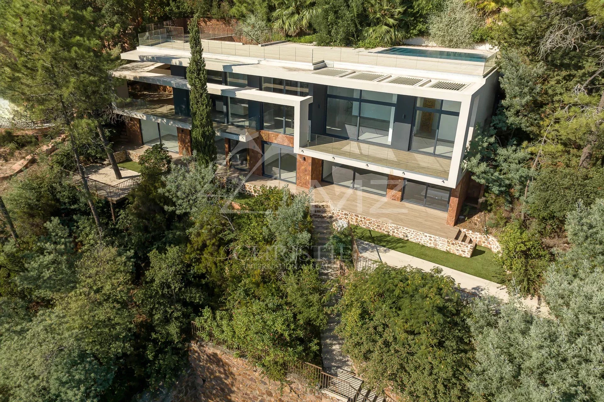 In a secure gated domain overlooking the bay, new contemporary villa which fits perfectly into the landscape, designed by a renowned architect, built on 2 levels and developing more than 300 m2 with its annexes. Quiet, out of sight, it has on 2 levels totaling approximately 255 m2 of living space, a very large living room with open kitchen and a bedroom on the ground floor and on the garden level, 4 other bedrooms including a master and a bedroom with independent access. The roof terrace benefits from a swimming pool with breathtaking sea views. Three large garages complete this property located 5 minutes from the beaches and restaurants of the Port of La Figueirette, 10 minutes from Théoule town center, 35 minutes from Cannes Croisette and 45 minutes from Nice Airport.