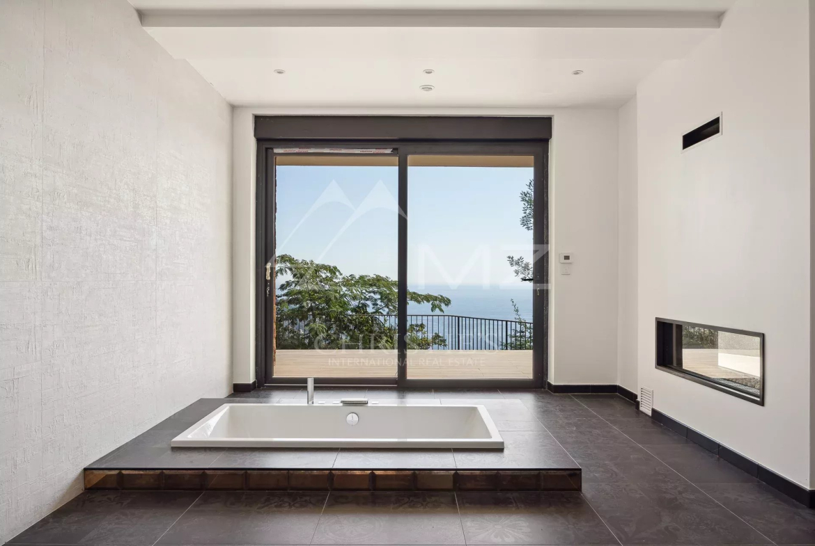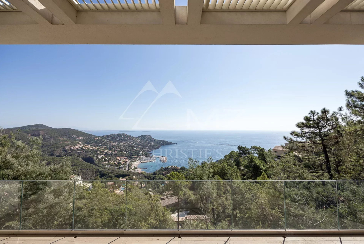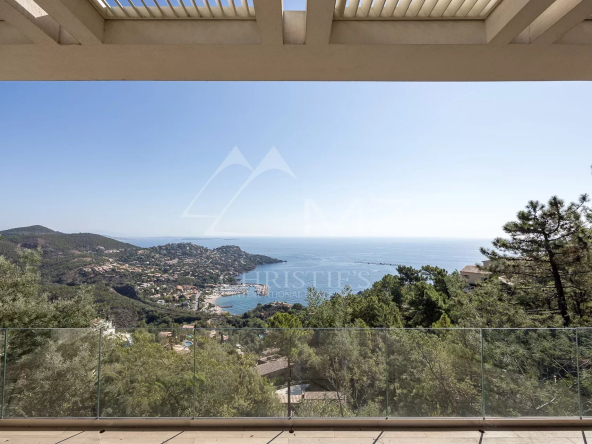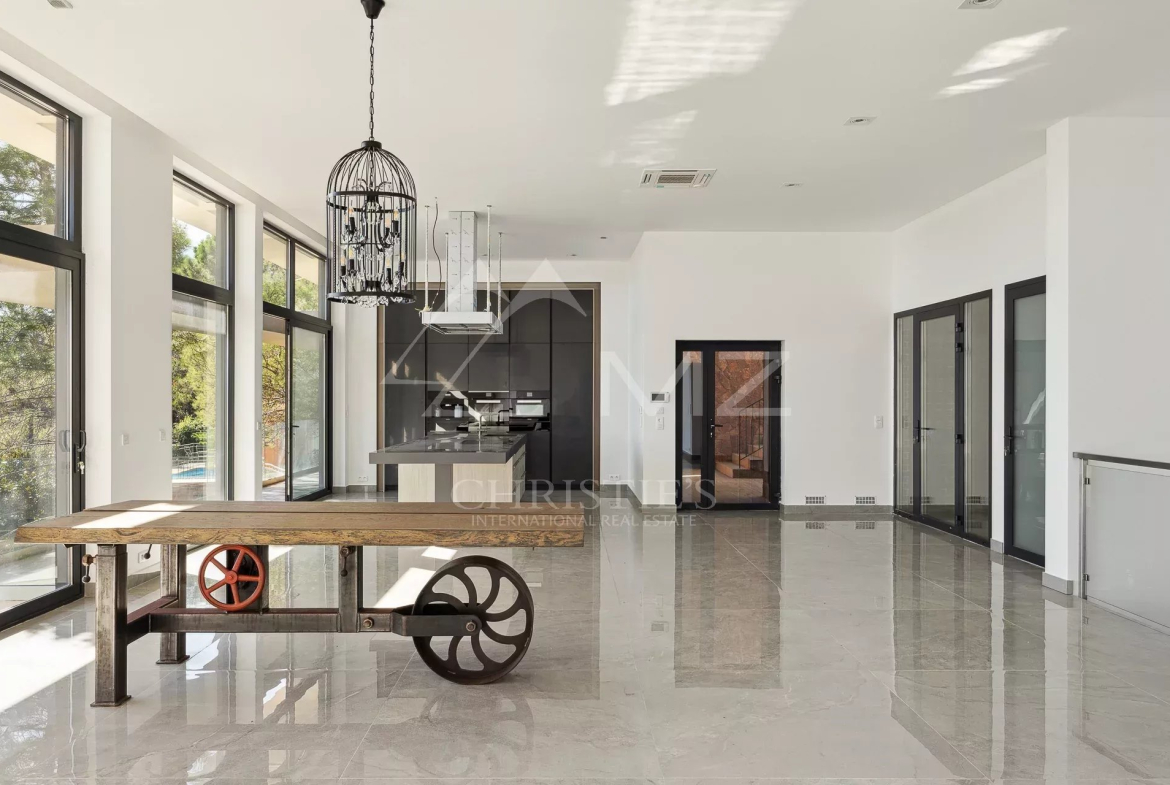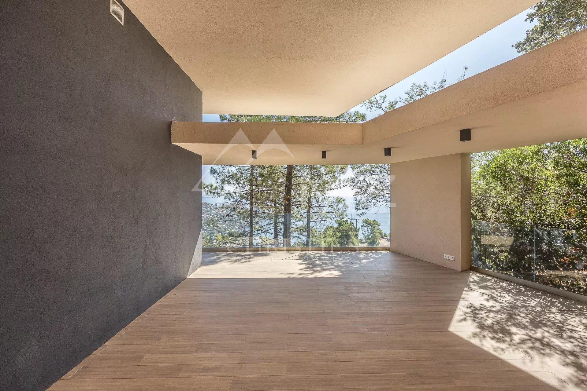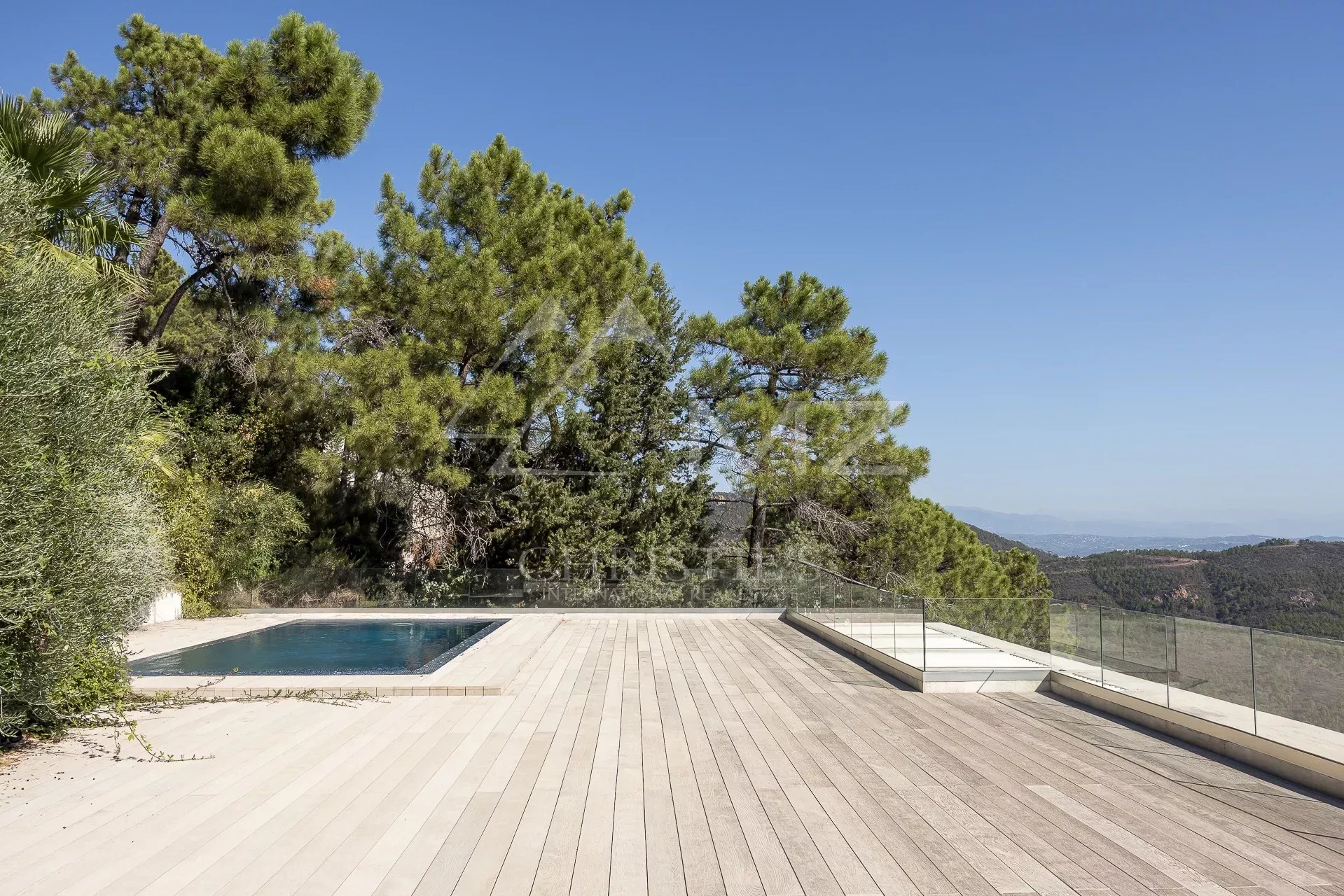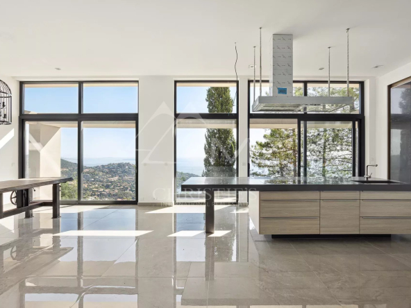 In a secure gated domain overlooking the bay, new contemporary villa which fits perfectly into the landscape, designed by a renowned architect, built on 2 levels and developing more than 300 m2 with its annexes. Quiet, out of sight, it has on 2 levels totaling approximately 255 m2 of living space, a very large living room with open kitchen and a bedroom on the ground floor and on the garden level, 4 other bedrooms including a master and a bedroom with independent access. The roof terrace benefits from a swimming pool with breathtaking sea views. Three large garages complete this property located 5 minutes from the beaches and restaurants of the Port of La Figueirette, 10 minutes from Théoule town center, 35 minutes from Cannes Croisette and 45 minutes from Nice Airport.