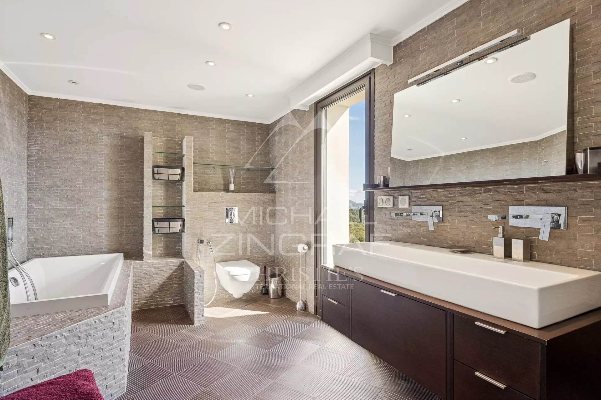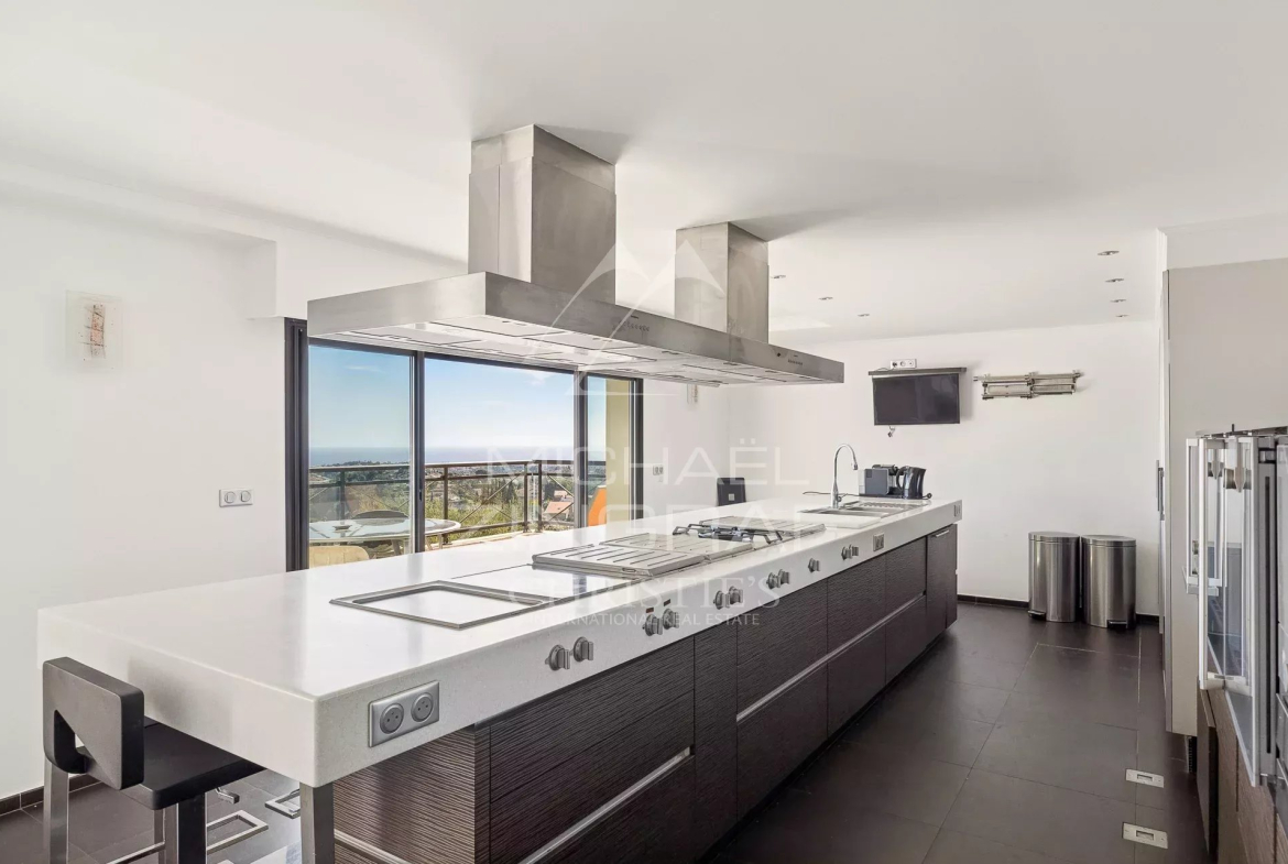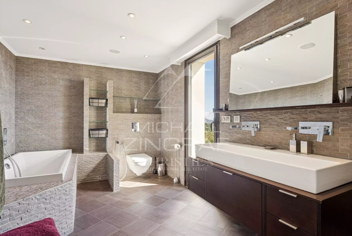 It consists of a large, bright living room of approximately 75 m² with fireplace and library, opening onto a south-facing terrace and the infinity pool, a semi-professional fitted kitchen, a master suite of approximately 40 m² with hammam and sea view terrace, as well as two bedrooms with bathrooms and private terraces.