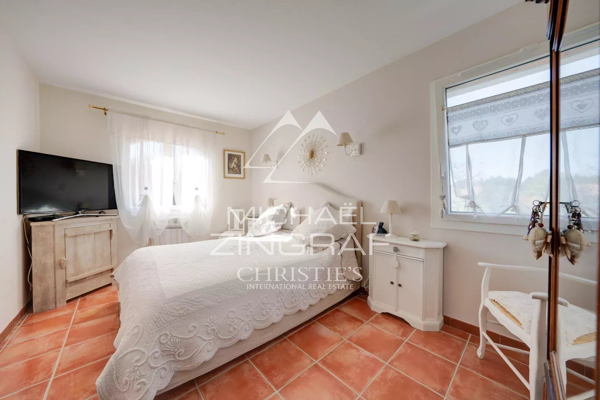 The upper floor is dedicated to the sleeping area and consists of two beautiful, very bright bedrooms with unobstructed views of the garden, a dressing room and a large bathroom.