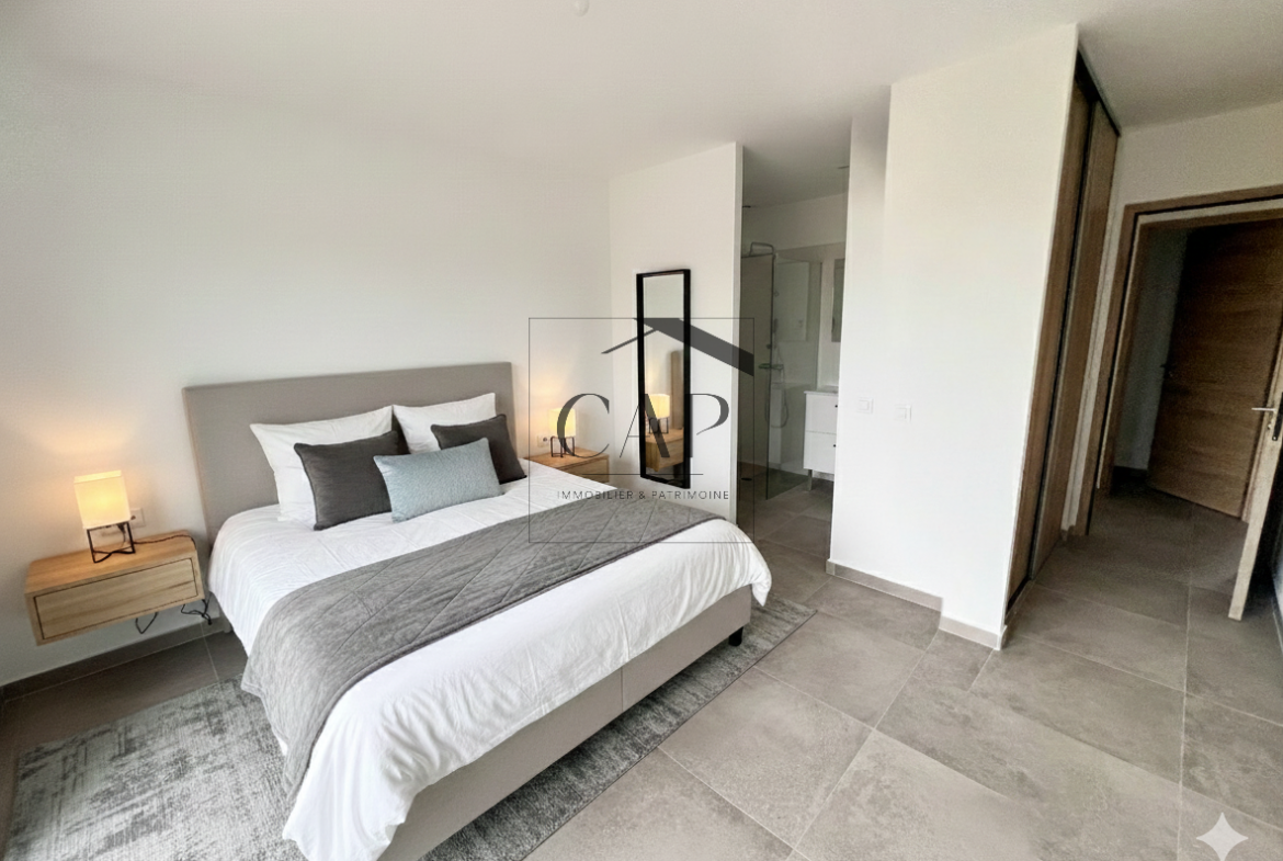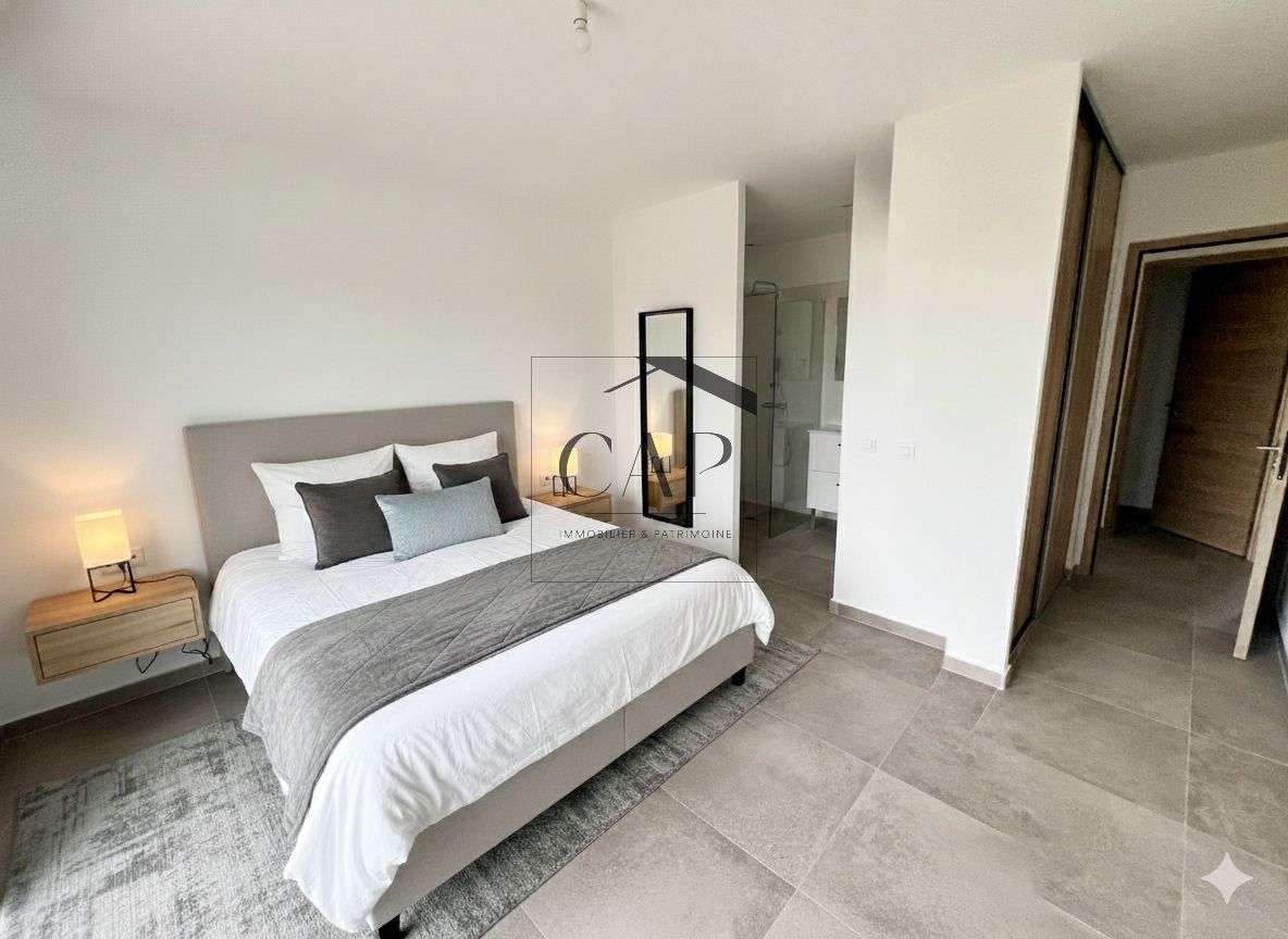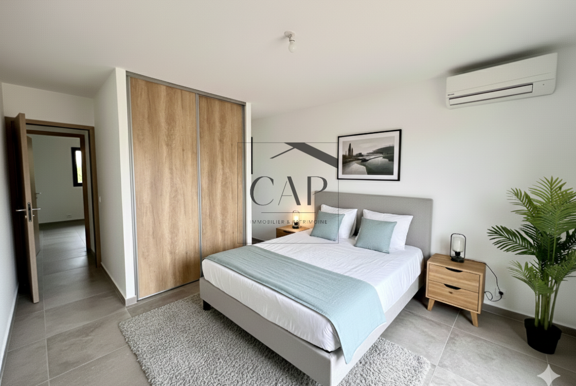 New detached 3-bedroom villa offering 110 sq m of living space, set on elevated grounds with open views in Sainte-Lucie de Porto-Vecchio. The property features a private 603 sqm garden with swimming pool, a bright living room with open-plan kitchen, three bedrooms each with en-suite shower room, and a covered 10 sqm terrace. Reversible air conditioning, garage, fenced plot, and immediate availability complete this peaceful, modern home.