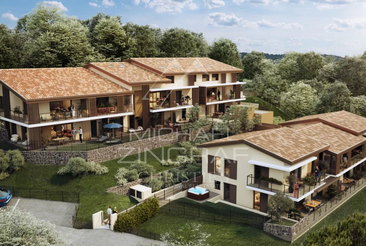 In the heart of Les Adrets de l'Esterel, overlooking the church square, within a secure residence, this new development is a small-scale condominium of just 16 apartments, spread across two buildings. Its contemporary construction, compliant with RE2020 standards, and its Mediterranean architecture allow it to blend seamlessly into its surroundings: fine render, graphic sunshades, glass railings, stone-clad retaining walls, and variegated double-channel tile roofs.