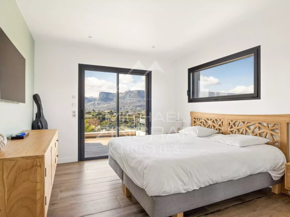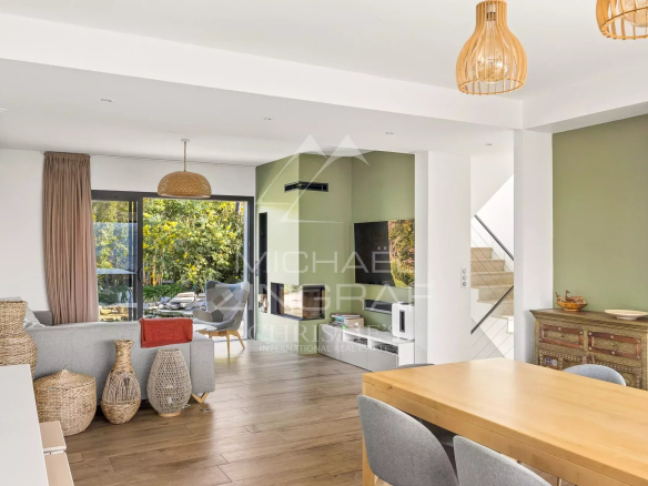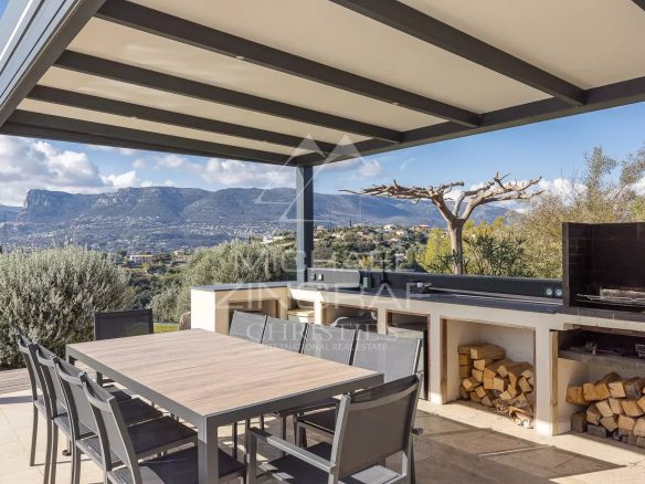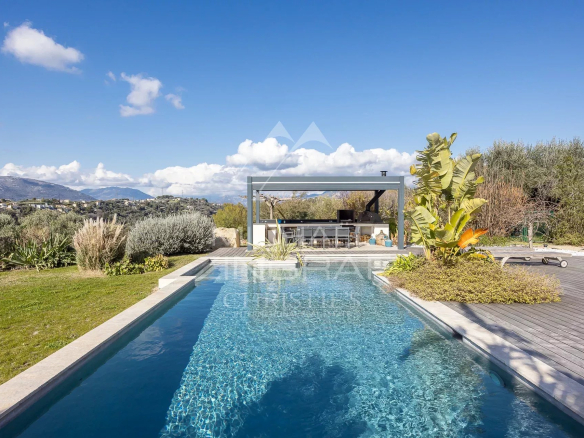 Outside, the living spaces are arranged around a heated saltwater pool with an exotic wood deck and a pleasant reception area with a summer kitchen under a pergola and a pizza oven, ideal for fully enjoying the French Riviera climate.
