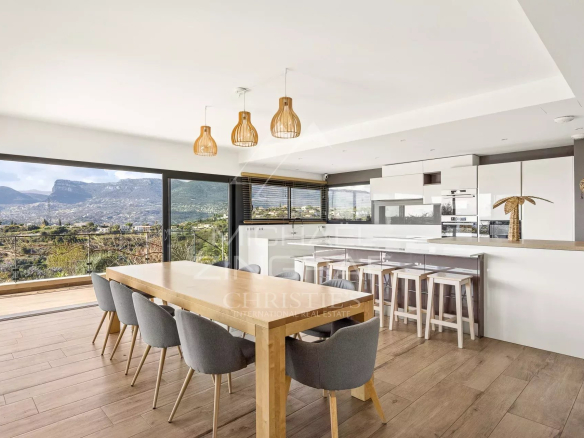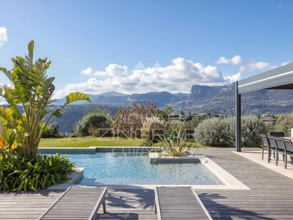 Exclusive. Nestled in the sought-after Crémat area, in the hills above Nice, this contemporary villa of approximately 330 m² enjoys a dominant position offering superb unobstructed views of the hills and mountains all the way to the sea.