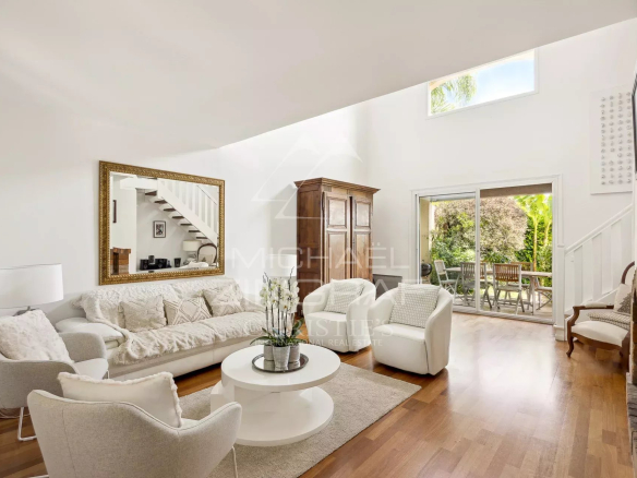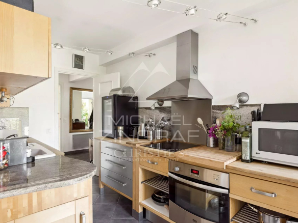 Built on two levels, it impresses with its bright, cathedral-ceilinged living room with fireplace, opening onto beautiful terraces and a meticulously maintained garden. The garden level comprises a fully equipped kitchen with a dining area, a bedroom with an en-suite shower room, and a laundry room.