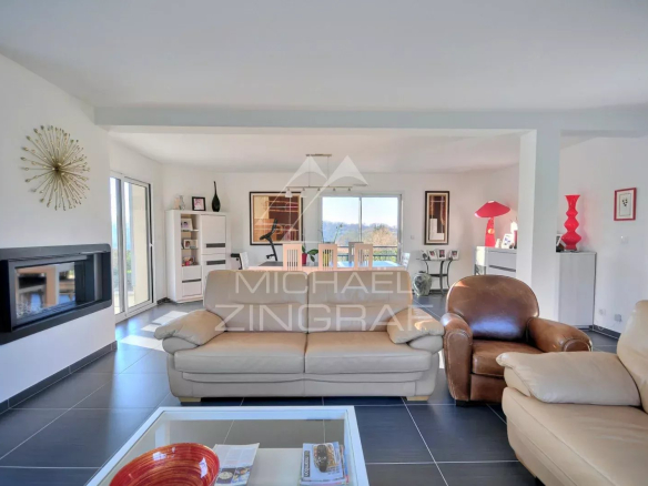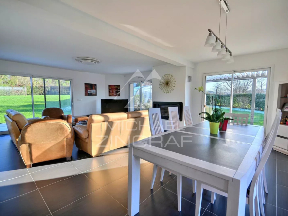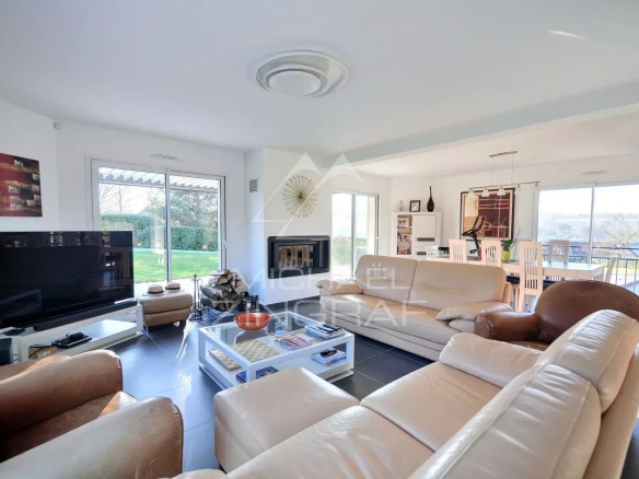 This charming house, built in 2015 and offering 261 sq m of living space, features a separate entrance, a large, triple-aspect living/dining room with a fireplace insert, terraces, an open-plan fitted and equipped kitchen, a utility room with a laundry area, and an office.