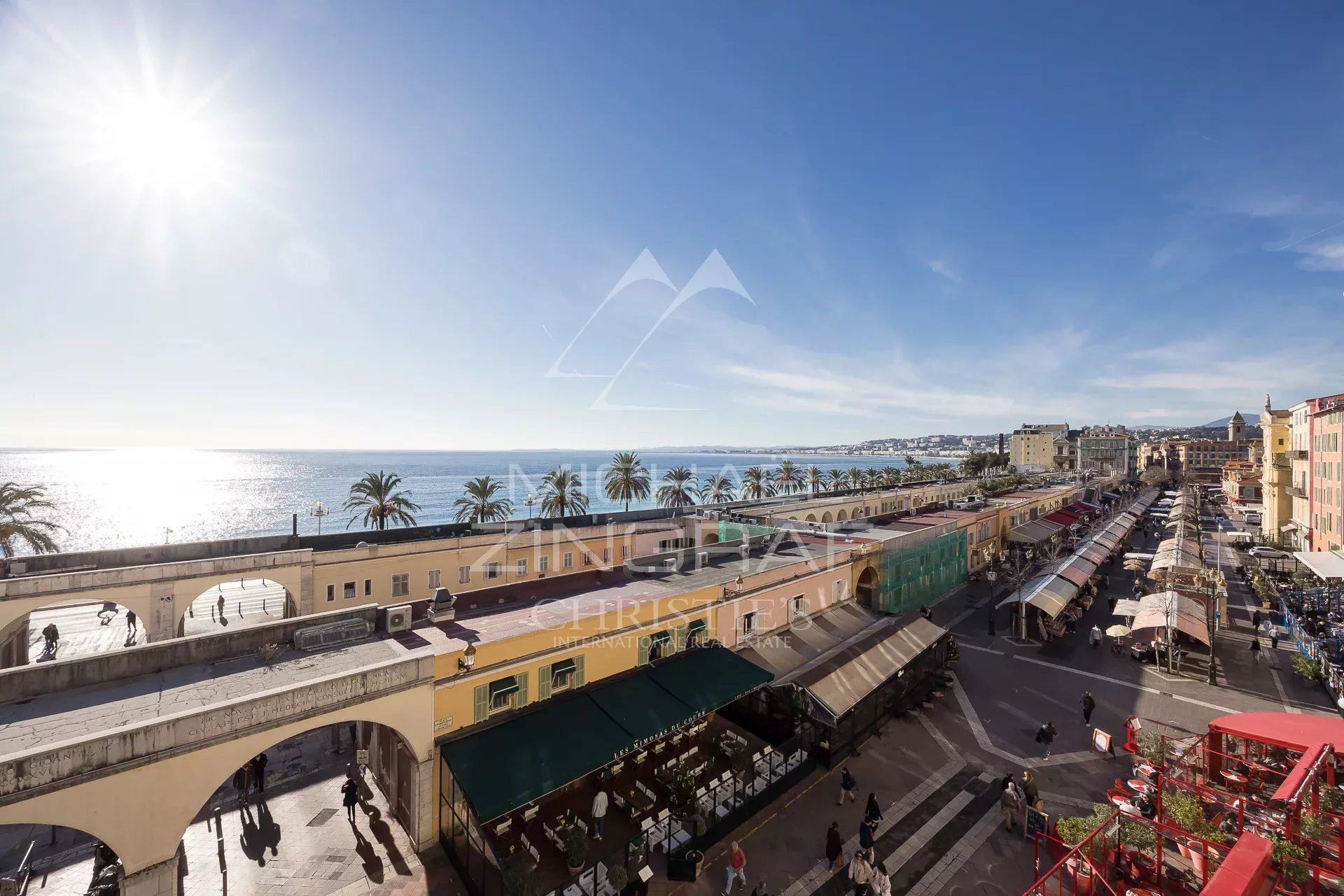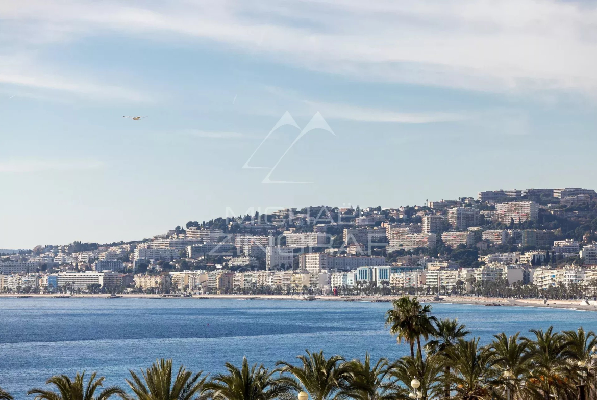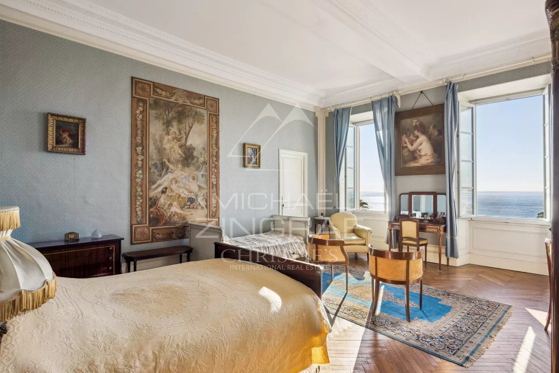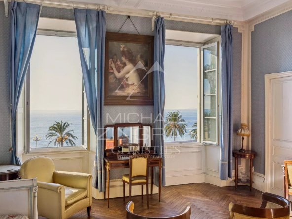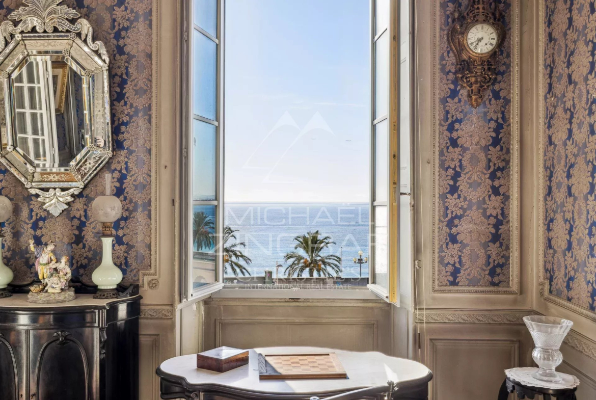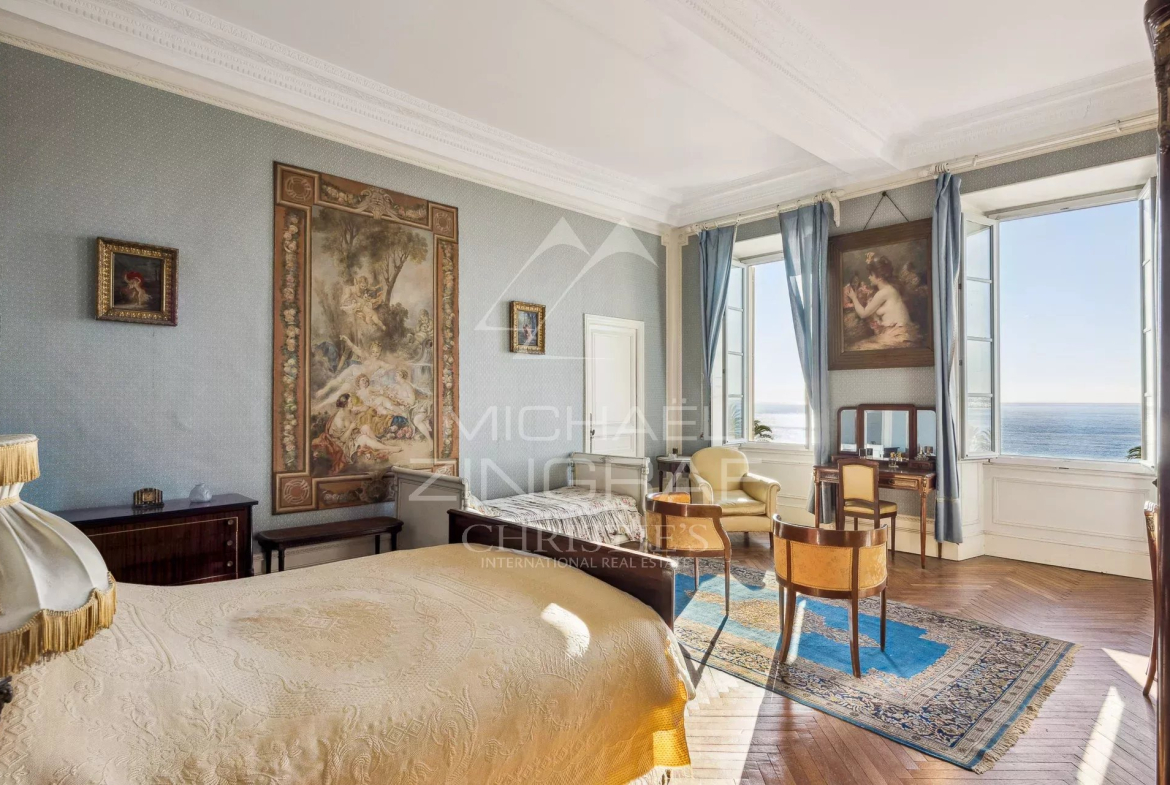 Michaël ZINGRAF Real Estate Nice presents to you at the foot of the Colline du Château and with a breathtaking sea and city view a crossing apartment of 265.23m² of living space in a magnificent classic 18th century building recently restored.