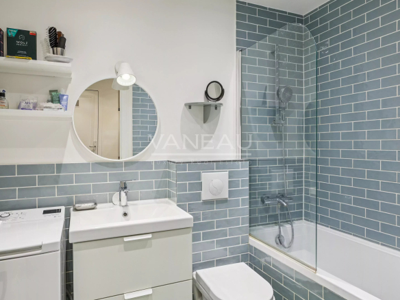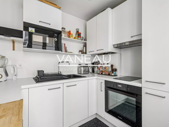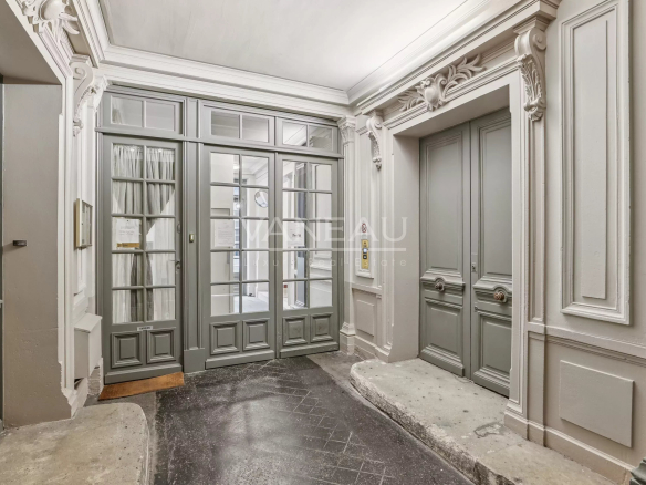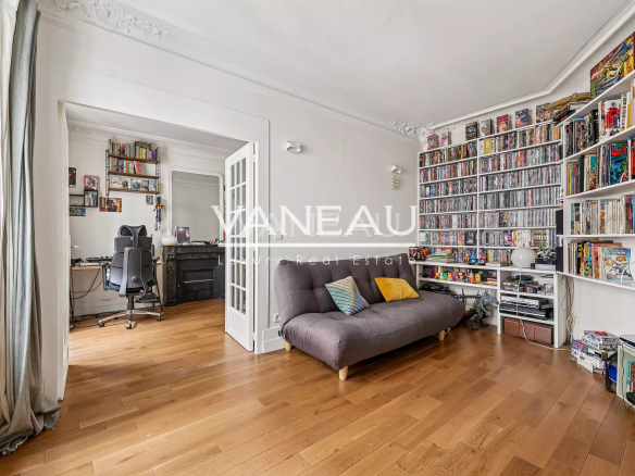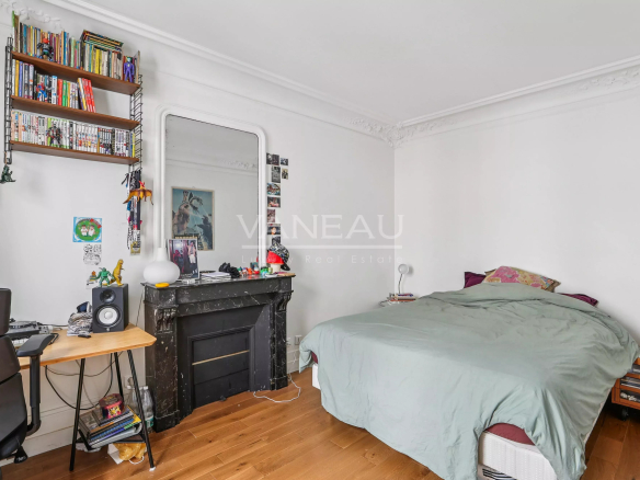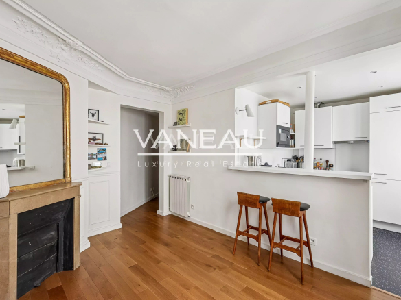 Benefiting from the charm of period features (new parquet flooring, moldings, and fireplaces) and modern amenities (boiler, double-glazed windows), this apartment offers spacious rooms and a peaceful atmosphere. It comprises an entrance hall leading to a pleasant living room with an open-plan kitchen, two bedrooms, and a bathroom with toilet.