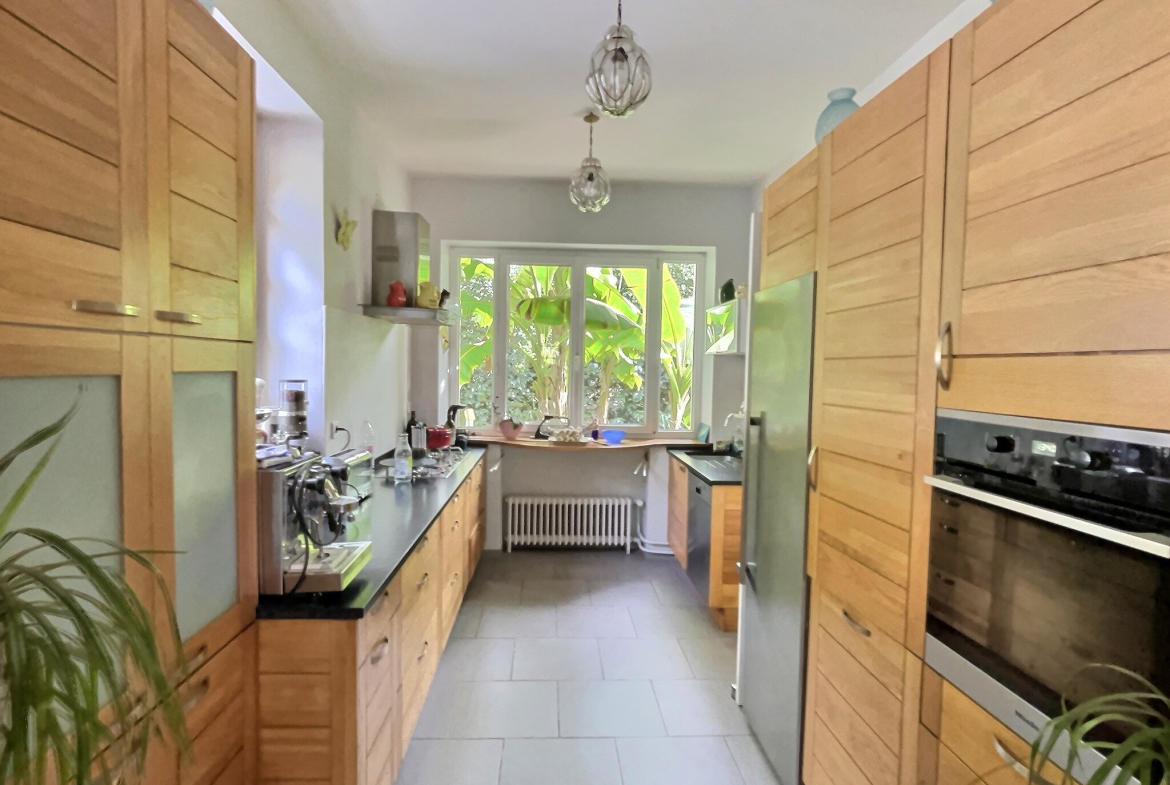 The space extends into a fitted kitchen and dining area opening onto a south-facing stone terrace, ideal for enjoying the park and the sunshine.