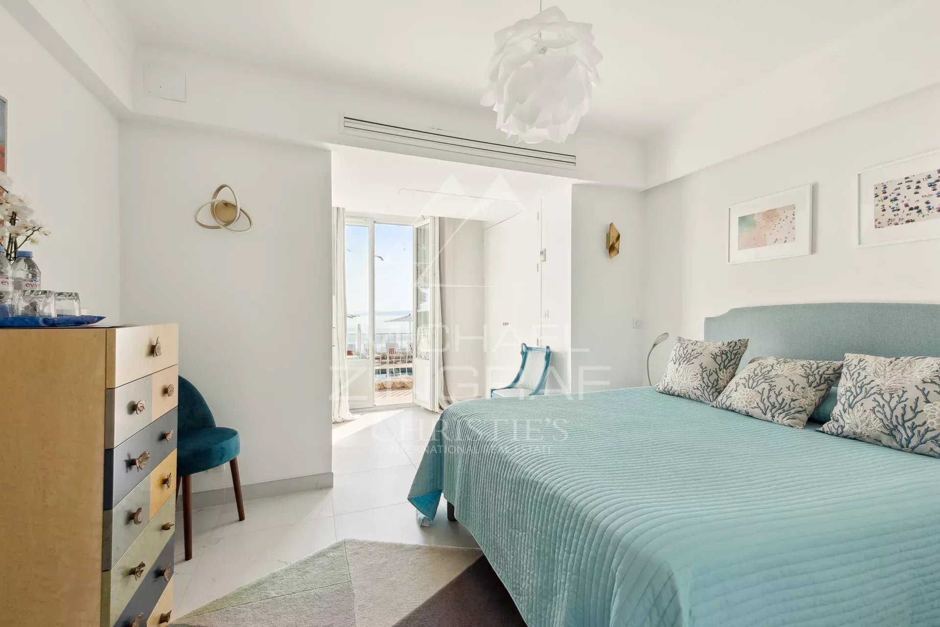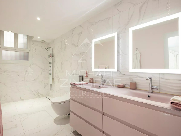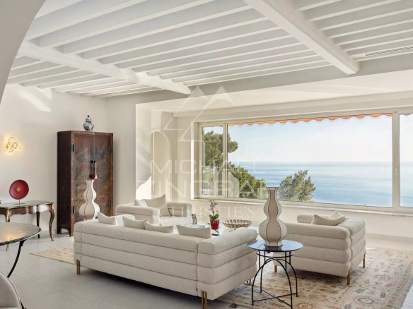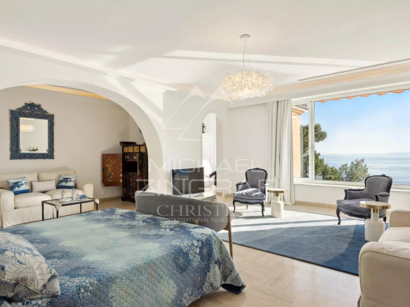 The main villa, with its warm and authentic Provençal architecture, features five bedrooms with en-suite bathrooms, plus a separate studio, ideal for staff or additional guests. The light-filled living spaces retain the charm of Riviera homes while opening onto expansive terraces overlooking the sea.