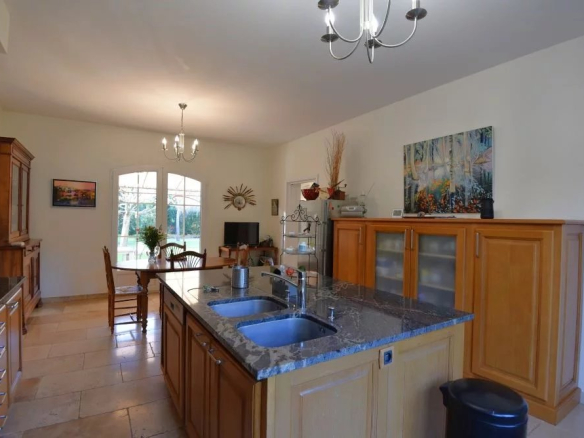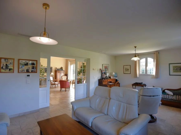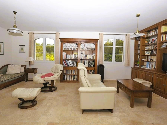 The light-filled, 80 sq m reception room is arranged around a fireplace and opens onto the terraces and garden, creating a seamless flow between indoors and outdoors. A separate TV lounge completes this welcoming and refined living space.