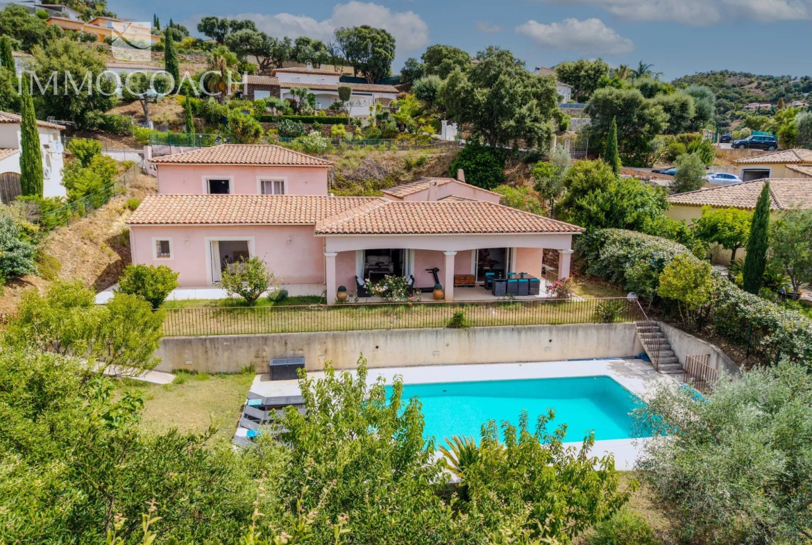 EXCLUSIVE. In a sought-after private estate in La Londe-les-Maures, on a 1325m² plot, you will be charmed by this discreet Provençal villa with unobstructed views. The ground floor offers a large living/dining room opening onto a beautiful 56m² terrace with a central fireplace, a semi-open kitchen, two large en-suite bedrooms with bathrooms, and ample storage. Upstairs, there are two bedrooms opening onto a lovely balcony with unobstructed views, and a shower room. An annex/games room, a utility/boiler room, and a large garage complete this property. The 9x5m south-facing swimming pool allows you to make the most of sunny days.