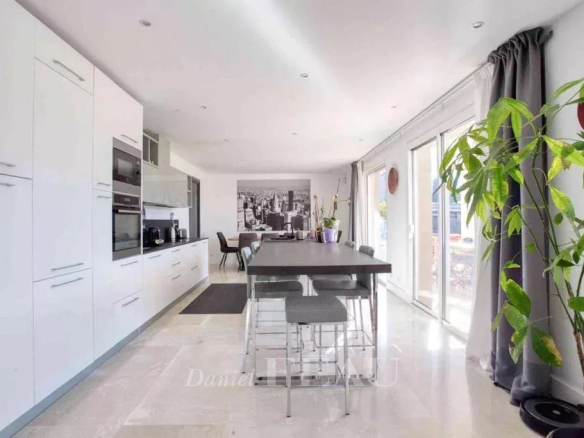 The main house offers on the ground floor, in an open and very bright loft style, an entrance, a vast living room of 85 m², an open kitchen opening onto a large summer terrace, a pantry communicating with the 36 m² garage, a master suite and a bedroom used as an office.