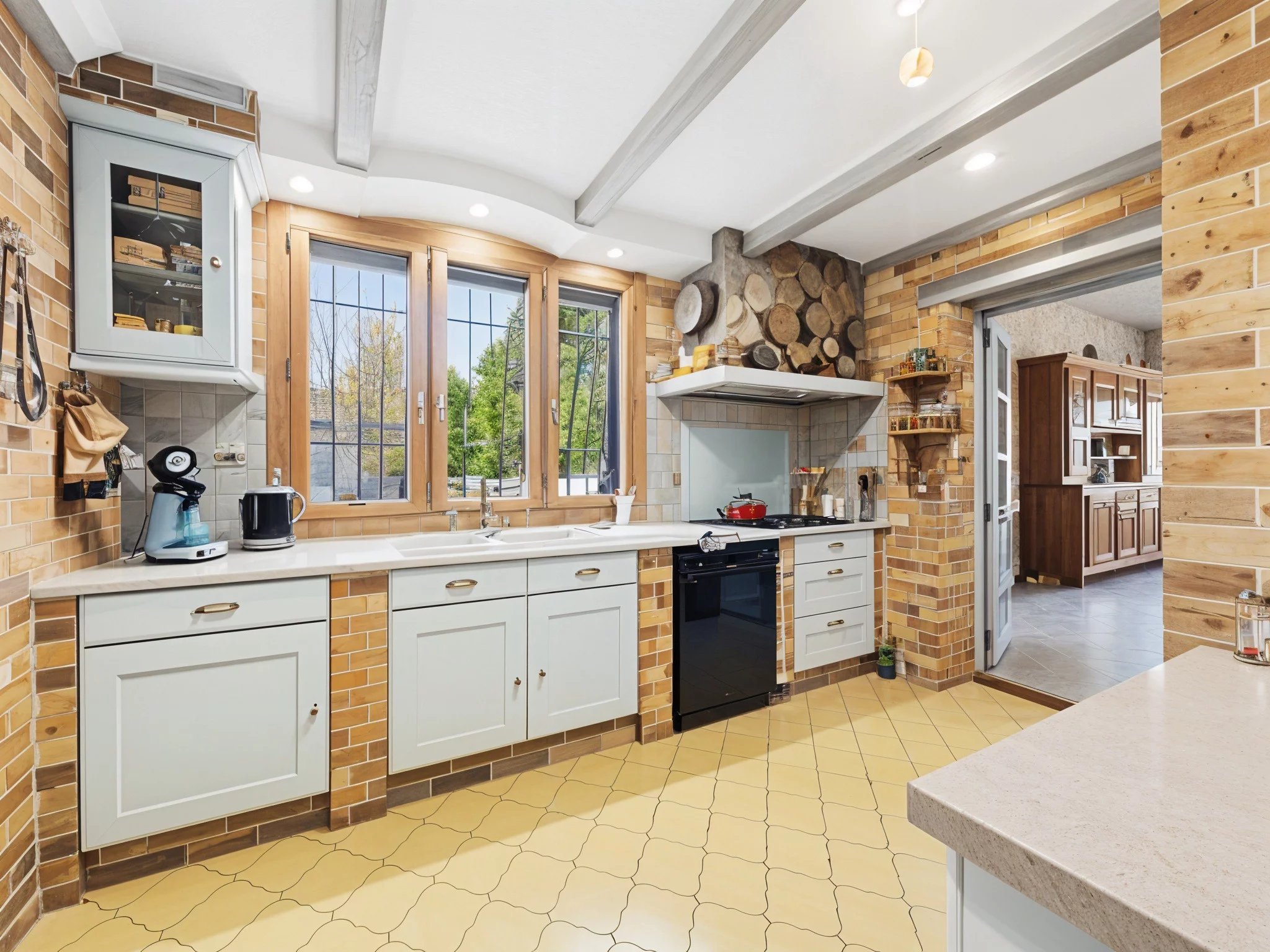 The hallway leads to a separate, functional kitchen with a pantry.