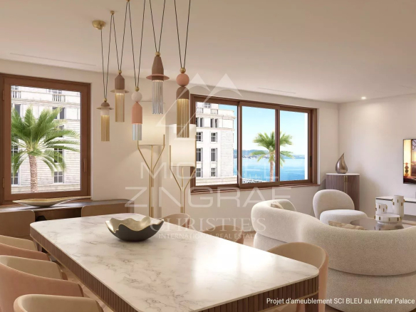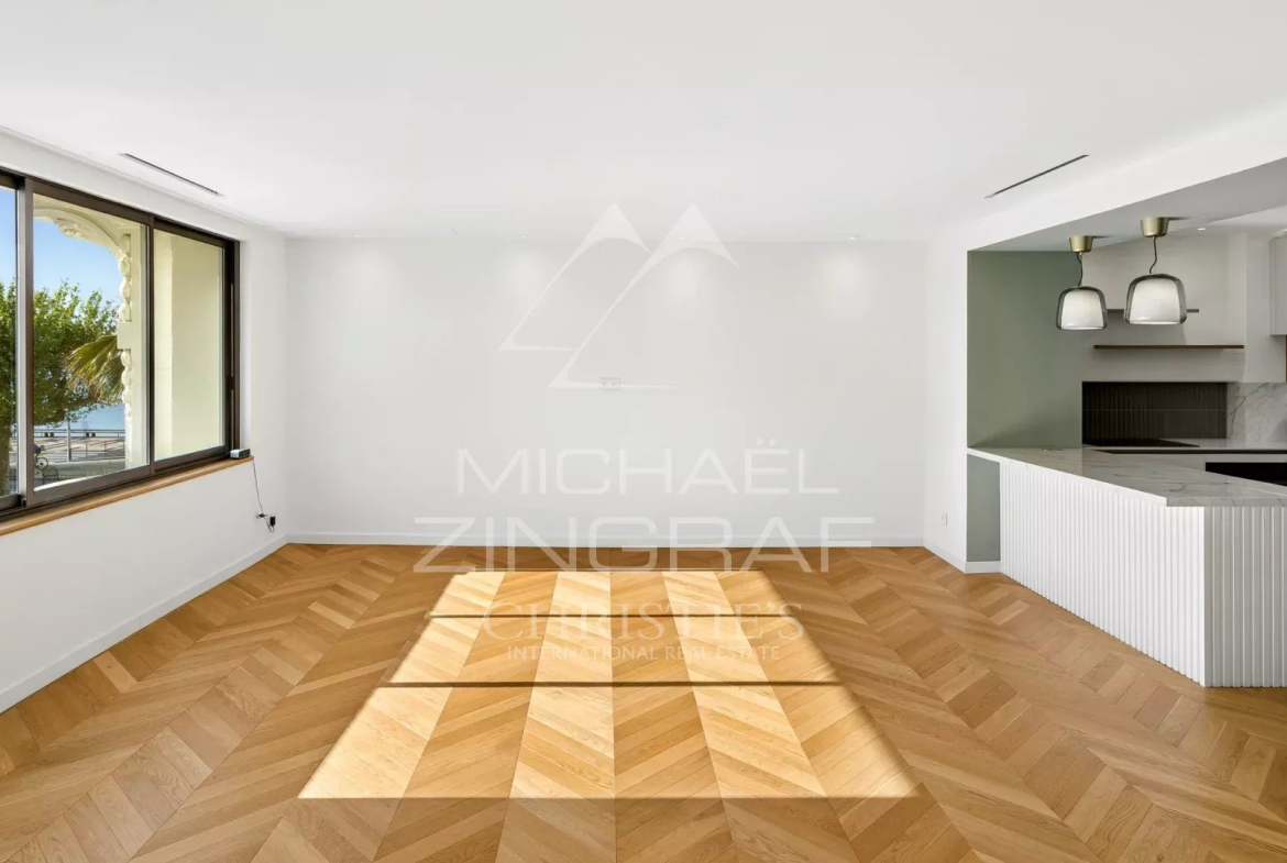 On the first floor of a historic building in the heart of the Golden Triangle, just 30 meters from the beaches and steps from shops, this tastefully and meticulously renovated apartment features a living/dining room and a fully equipped open-plan kitchen. The materials used play with their transparency, creating a bright and welcoming living space from the entrance, complemented by a sea view. The sleeping area includes a bedroom with a separate bathroom and another bedroom with an en-suite bathroom. A laundry area and separate WC have been cleverly designed to create an additional cozy space with ample storage on both sides. Ducted reversible air conditioning. A cellar is included. A true gem, where luxury, tranquility, and pleasure reign.