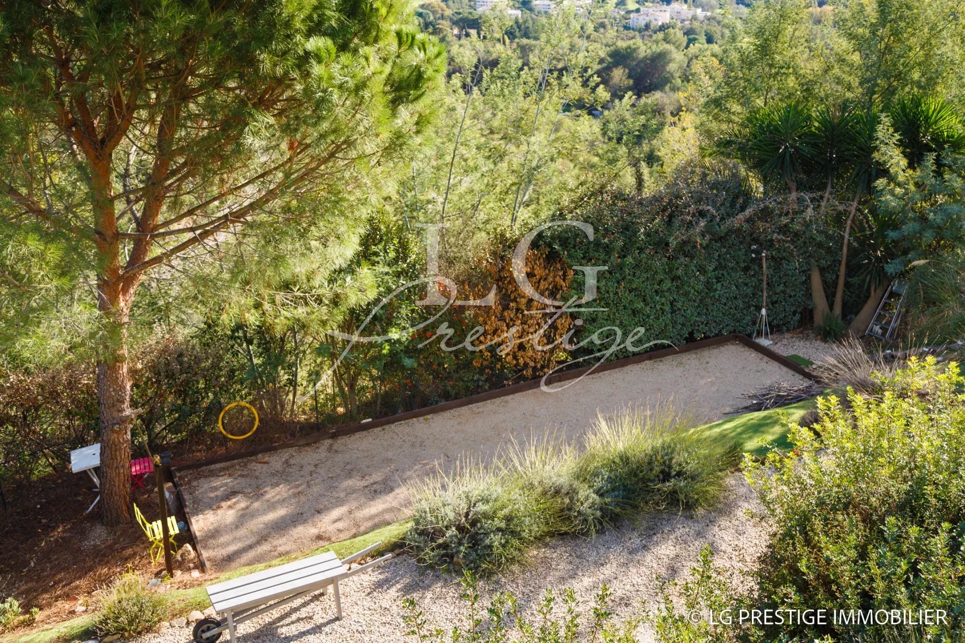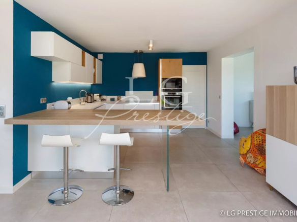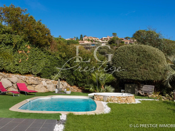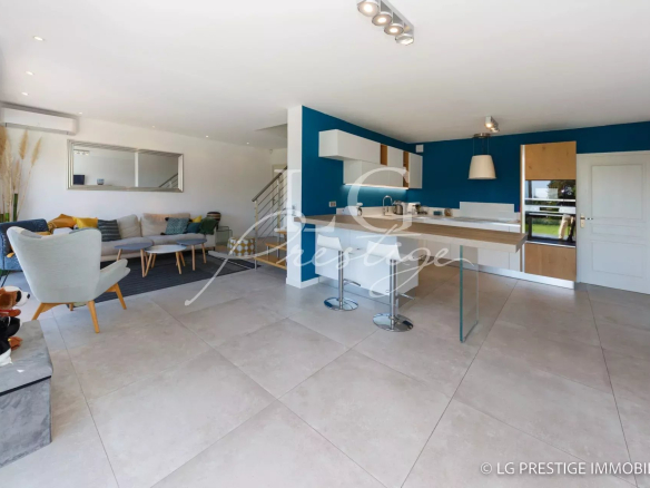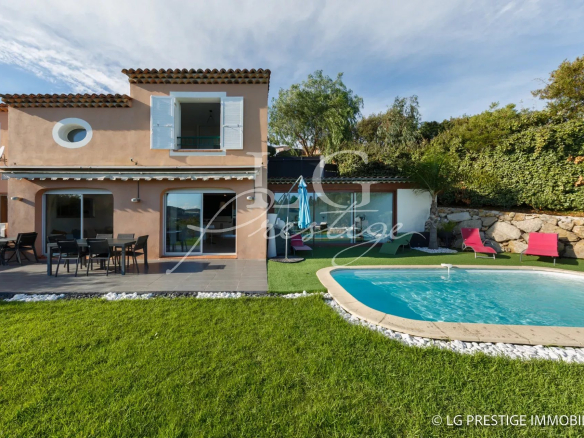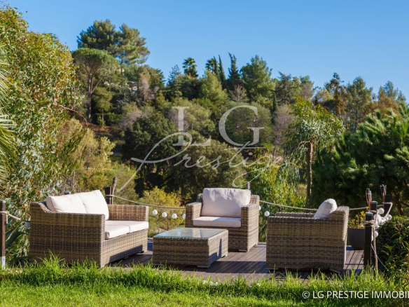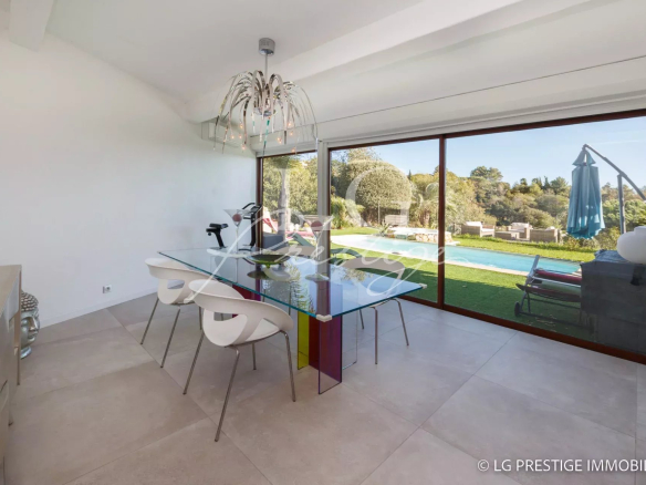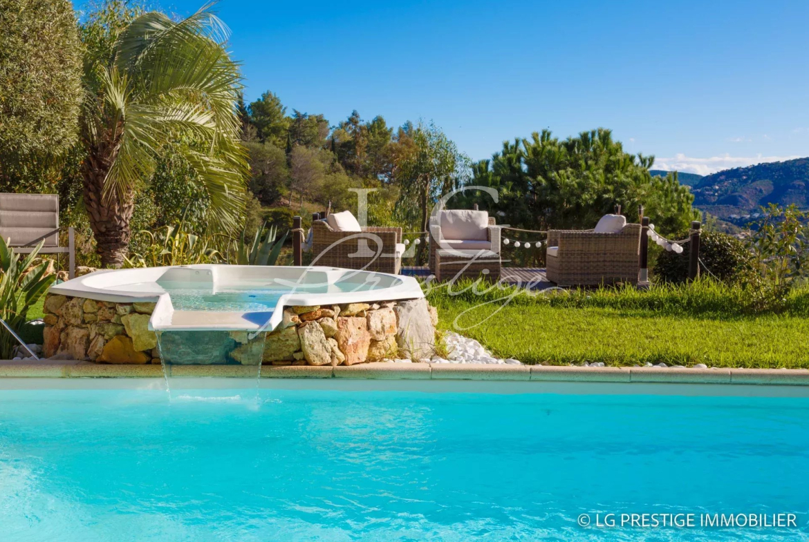 Under Contract – The Mandelieu agency presents this bright 141m² villa, ideally located in a quiet and secure 24/7 setting in Mandelieu, offering panoramic views of the surrounding greenery stretching to the sea. It comprises a magnificent living room, dining room, and fully equipped kitchen opening onto a lovely landscaped garden with a heated swimming pool and jacuzzi, three bedrooms including a master suite on the ground floor, an office, an attached garage, two parking spaces, and a pétanque court.