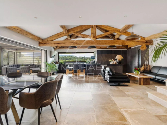 The house offers very spacious living areas on the ground floor, including a living room, dining room, and a unique open-plan kitchen with impressive size and high ceilings, as well as a TV lounge, all opening onto the outdoor terrace and swimming pool.
