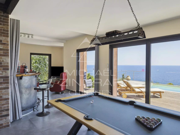 Nestled in a private estate in Anthéor, this renovated property of approximately 215 sq m enjoys a commanding position and breathtaking sea views. The entrance is on the upper level, where a small esplanade with a carport and parking spaces leads to the first floor. This level comprises an entrance hall, a living/dining room, a kitchen opening onto a terrace, two bedrooms, and a bathroom. On the lower level, a welcoming reception area opens onto a large wooden terrace with a heated lap pool. A master bedroom with a dressing room and bathroom completes this level. There is potential to create an additional bedroom in the reception area. A separate 10 sq m room could also be converted into a bedroom or office. The terraced garden of approximately 1,446 sq m provides a natural and intimate setting for this unique home. Located 5 minutes from the shops in Agay and 60 minutes from Nice Airport.