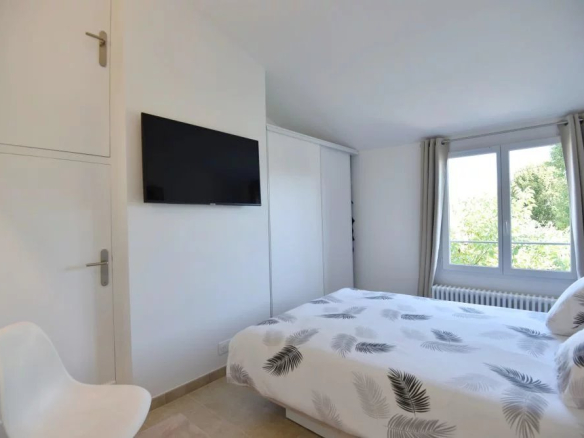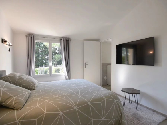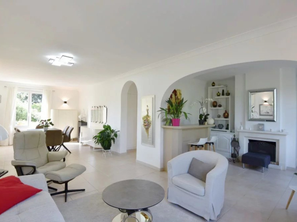The 60 m² living room, warm with fireplace, opens onto a large shaded terrace, a true outdoor living space, ideal for entertaining or enjoying the garden in complete tranquility.
