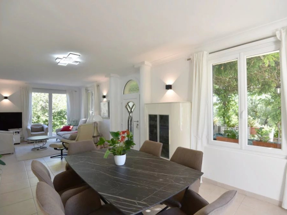 The 60 m² living room, warm with fireplace, opens onto a large shaded terrace, a true outdoor living space, ideal for entertaining or enjoying the garden in complete tranquility.