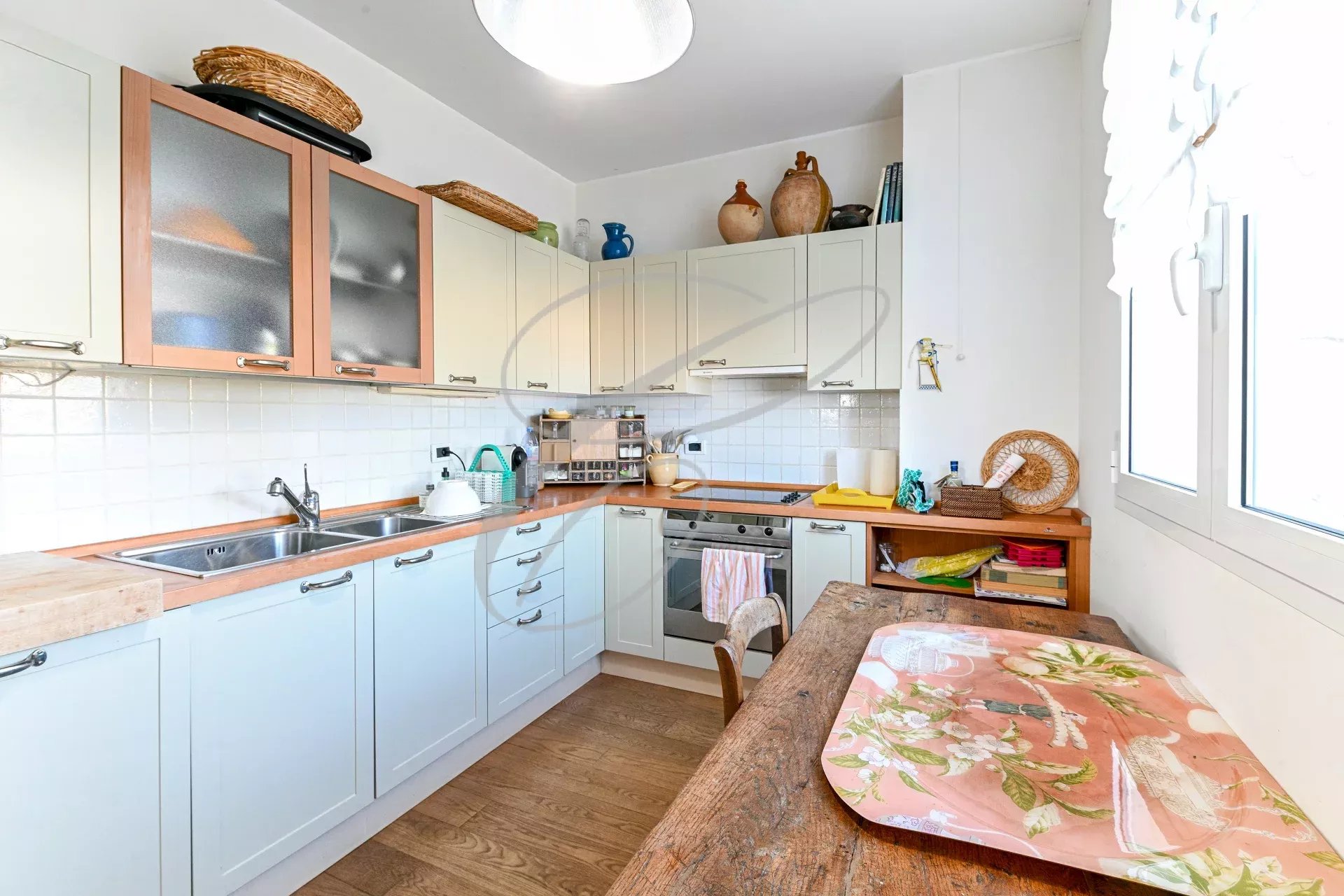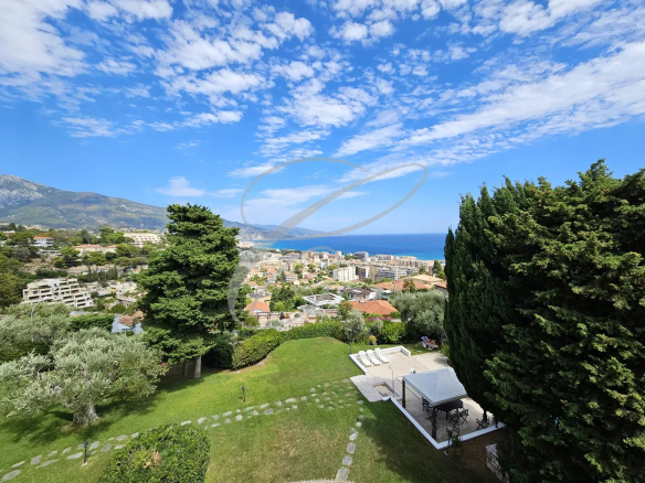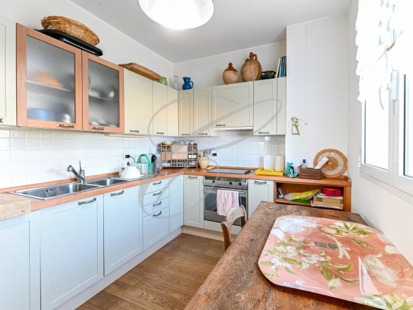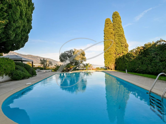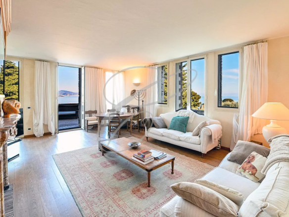 On the top floor of a small, secure, upscale residence, nestled in a peaceful park with a swimming pool, this charming 2-bedroom apartment boasts a beautiful terrace with panoramic sea views.