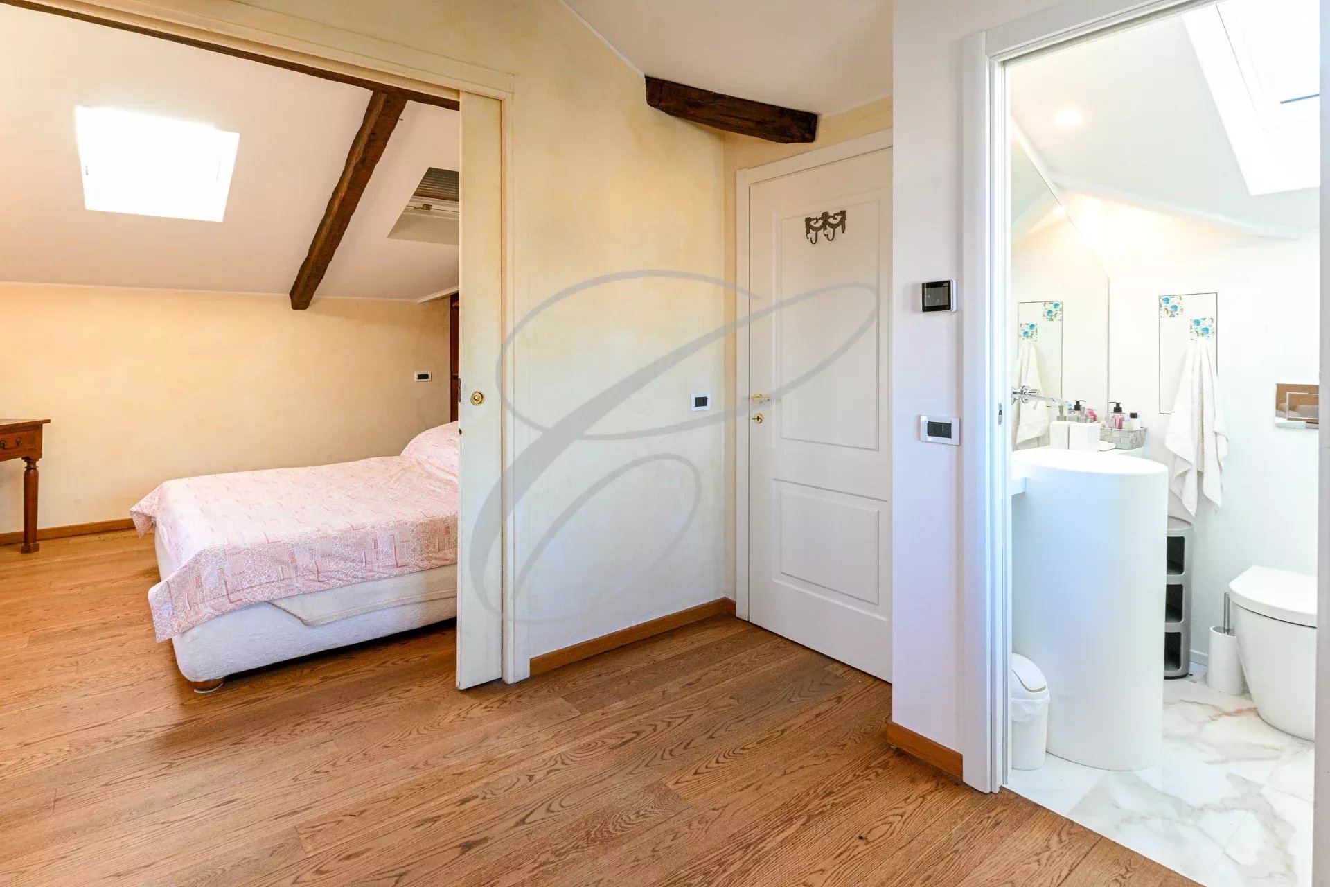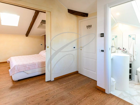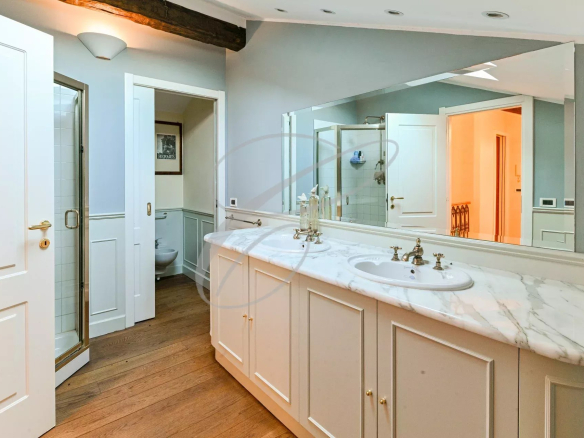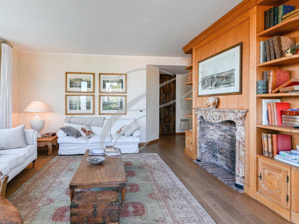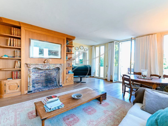 The apartment comprises an entrance hall, a lovely living room with a fireplace opening onto the sea-view terrace, a fully equipped kitchen, two bedrooms with en-suite bathrooms, a dressing room, and a laundry room.