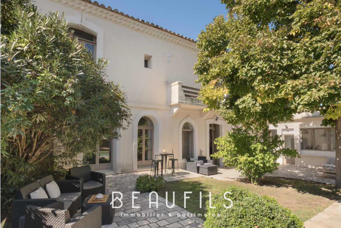 SAINT-LAURENT-D'AIGOUZE - Just 15 minutes from the beaches and 25 minutes from Montpellier, discover this charming 245 sq m (2,668 sq ft) 19th-century property, tastefully renovated throughout, blending period charm with modern comfort. The 160 sq m (1,722 sq ft) main living area impresses with its generous proportions, a living room with a fireplace, a fully equipped kitchen, and openings onto a secluded landscaped garden with a 5x4 m (23x16 ft) swimming pool. Upstairs, there are 5 bedrooms, including 4 suites, a bathroom, and a sun terrace. A 70 sq m (753 sq ft) outbuilding to be converted and a workshop complete this exceptional bastide. High-end features include ducted air conditioning, double-glazed windows, and meticulous renovation. Previously rented for €5,500/week during peak season. To arrange a viewing, please contact Anthony Fages at +33 7 71 15 70 03. Fees payable by the seller. RCS 831 872 304 www.xbimmoinvest.com/honoraires.pdf