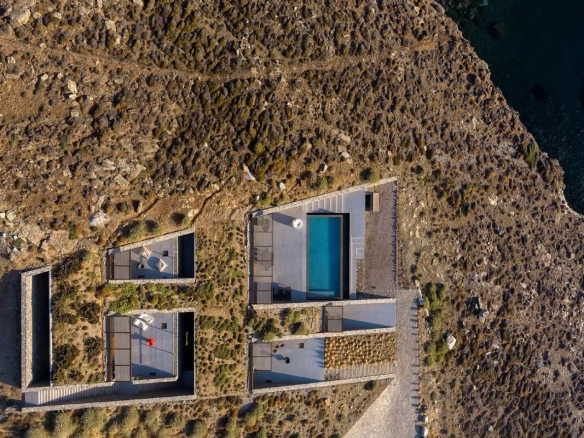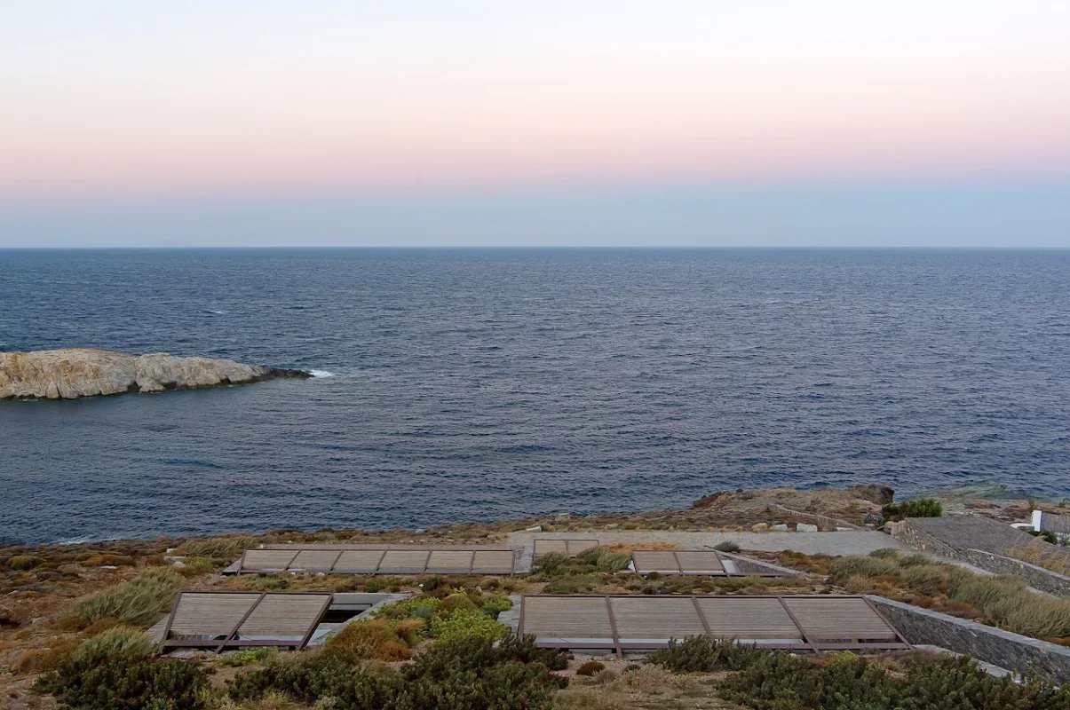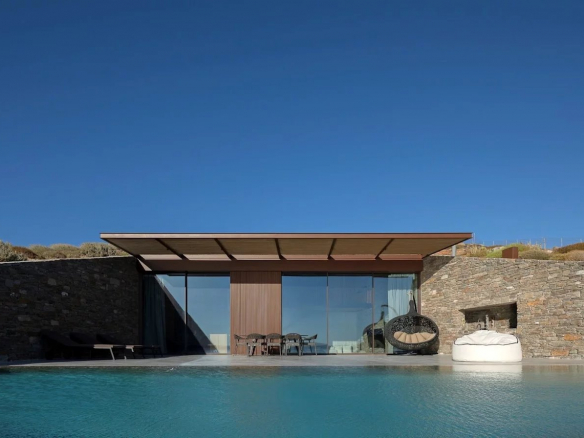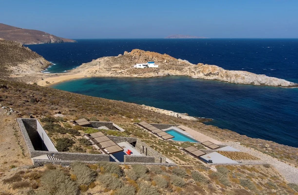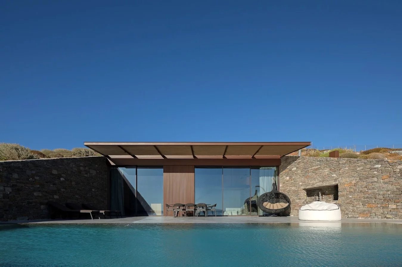 The villa's location is equally remarkable. Sheltered from the winds, it offers absolute tranquility while allowing guests to enjoy panoramic views of the sea, the church of Agios Sostis, and the island of Vous. The villa's modern, minimalist architecture blends seamlessly into the island's natural landscape.