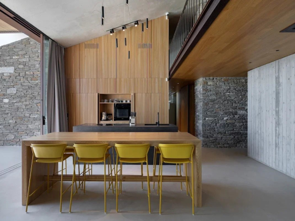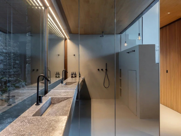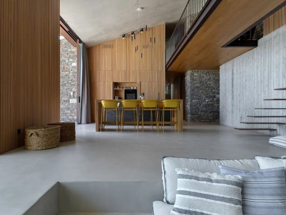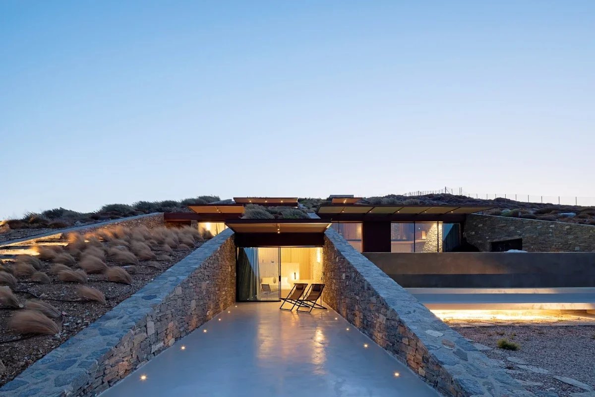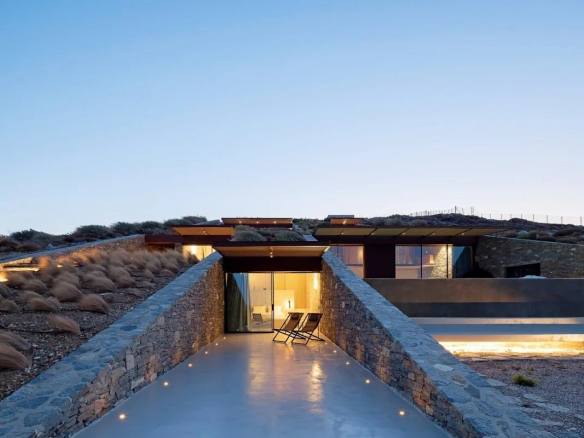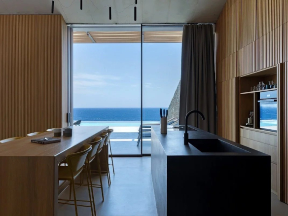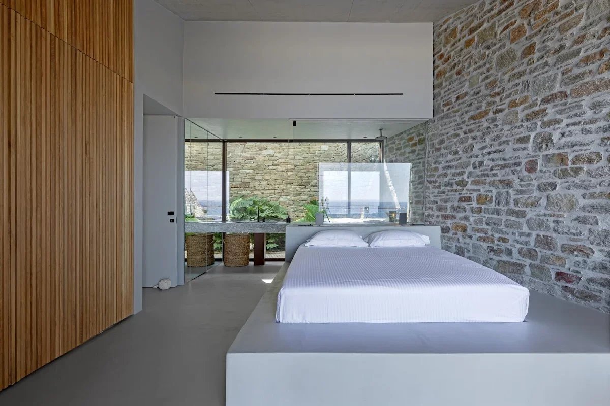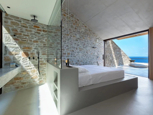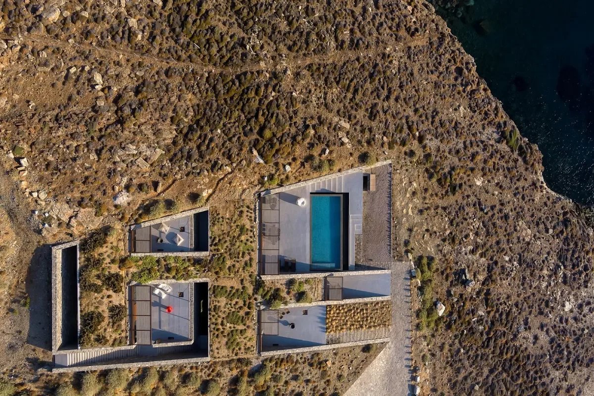 The villa's location is equally remarkable. Sheltered from the winds, it offers absolute tranquility while allowing guests to enjoy panoramic views of the sea, the church of Agios Sostis, and the island of Vous. The villa's modern, minimalist architecture blends seamlessly into the island's natural landscape.