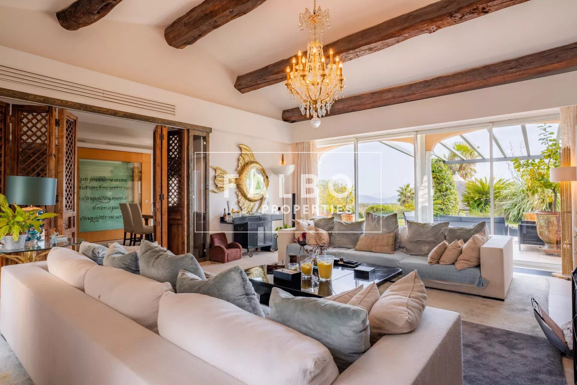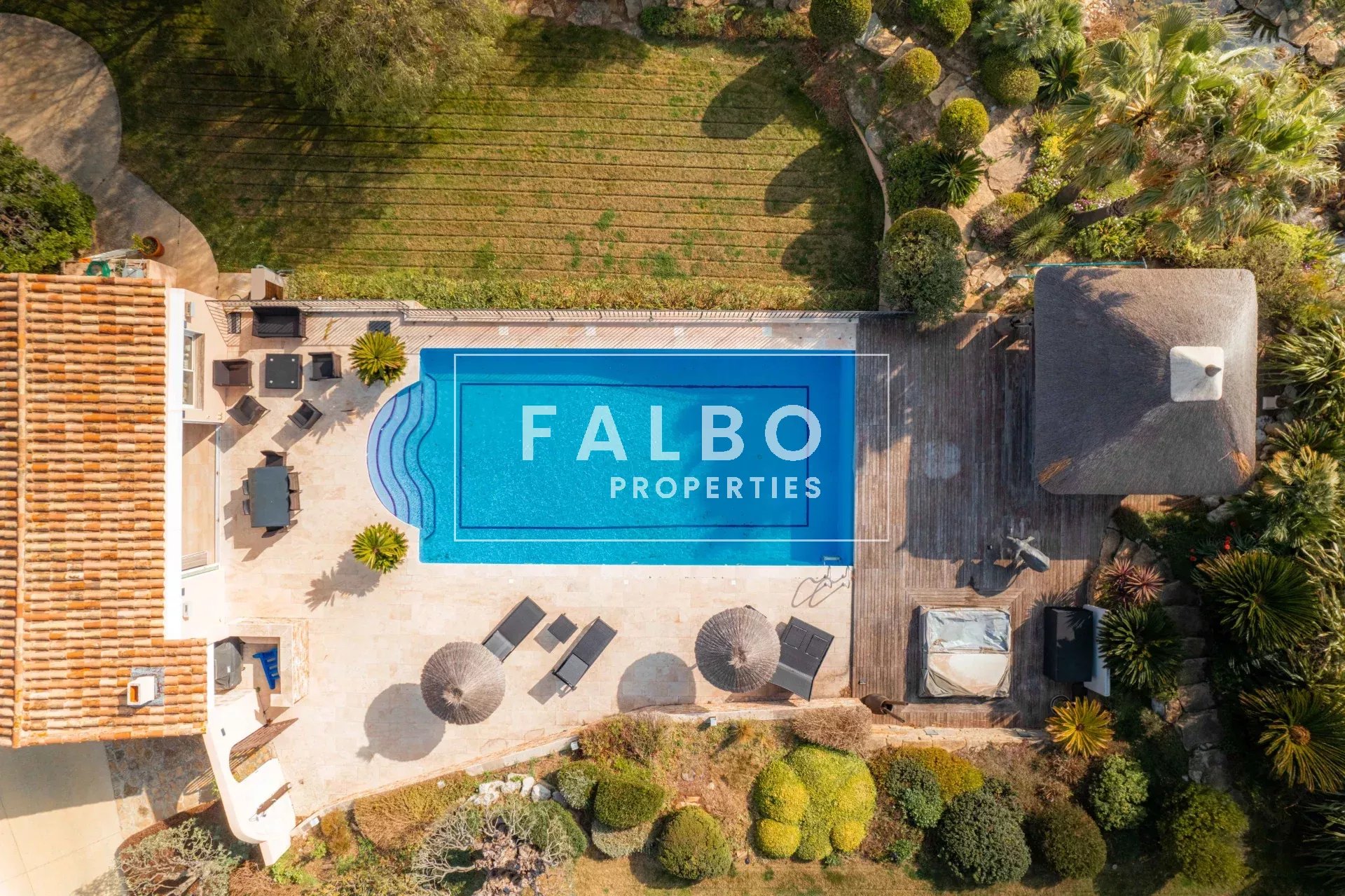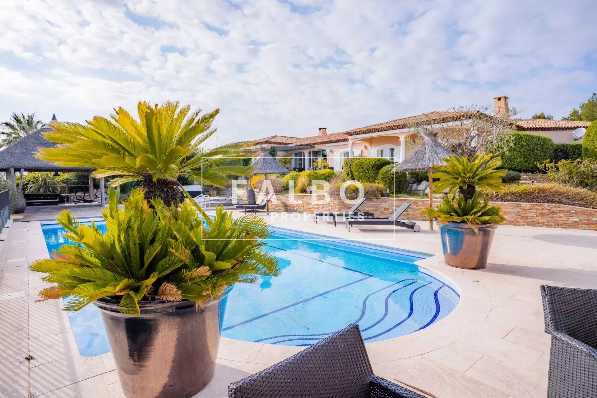 In a dominant position, in a quiet and perfectly secure location, the villa offers a 12×6 m heated swimming pool with jacuzzi and a large pool house, in the heart of a well-maintained environment bordered by an artificial river.