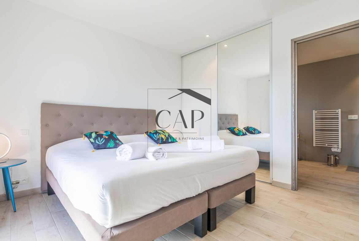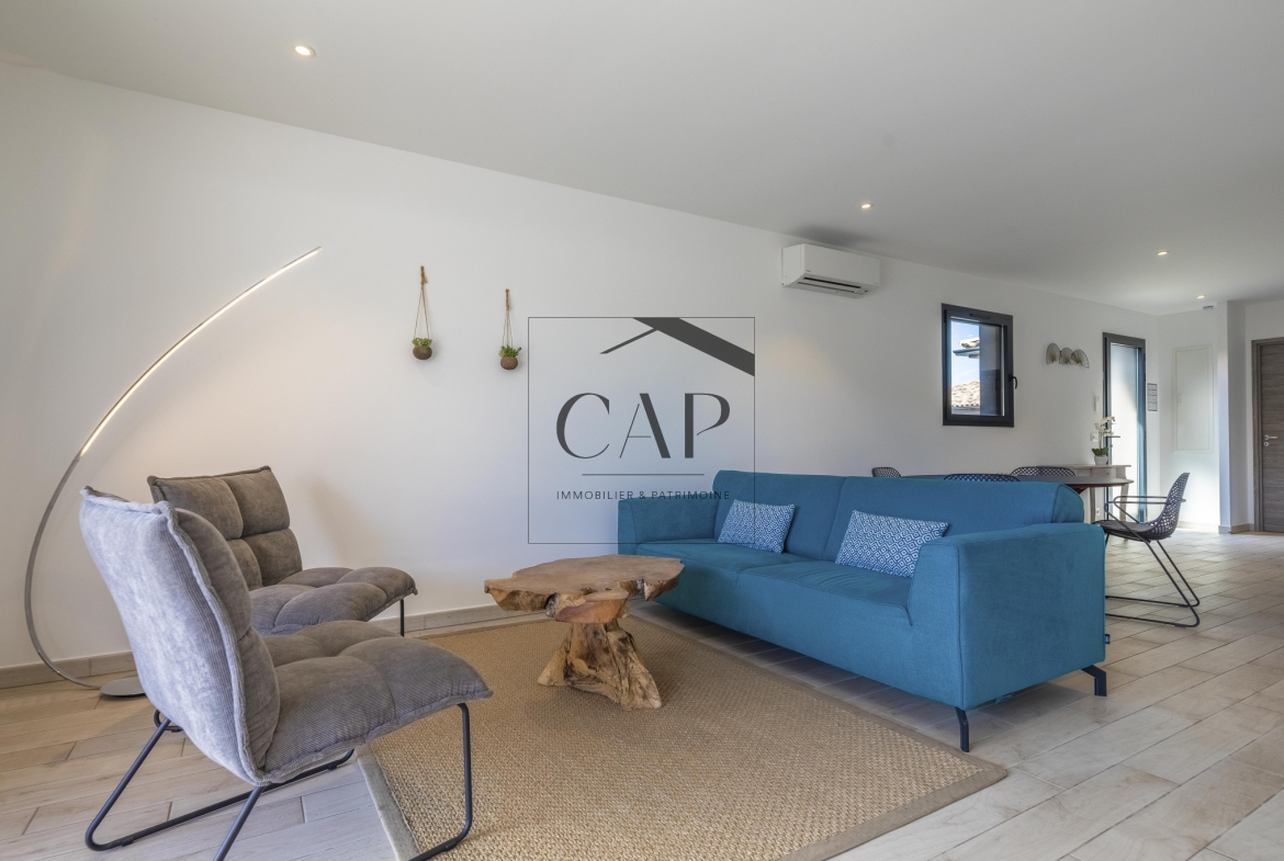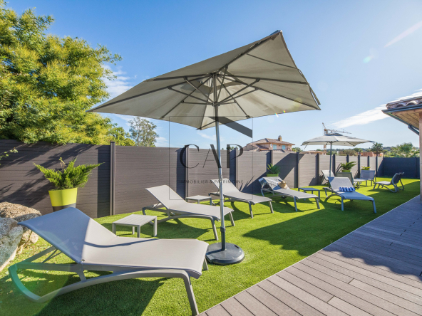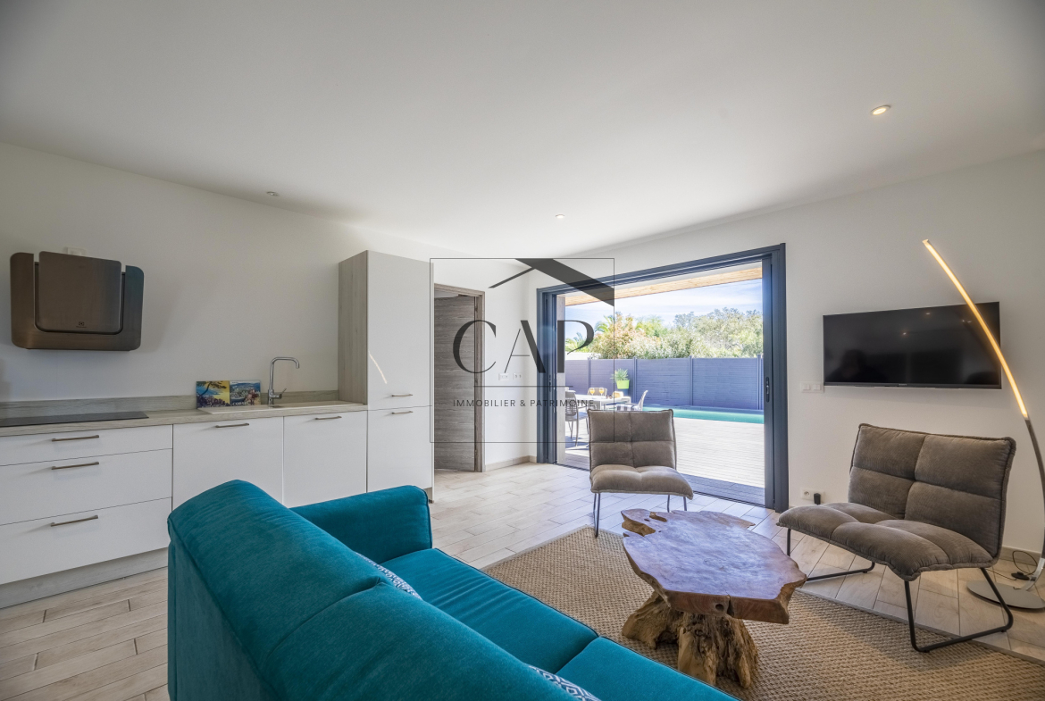CAP Immobilier & Patrimoine presents this unique and prestigious property in Southern Corsica, just steps from the magnificent Cala Rossa beach, within a private estate.