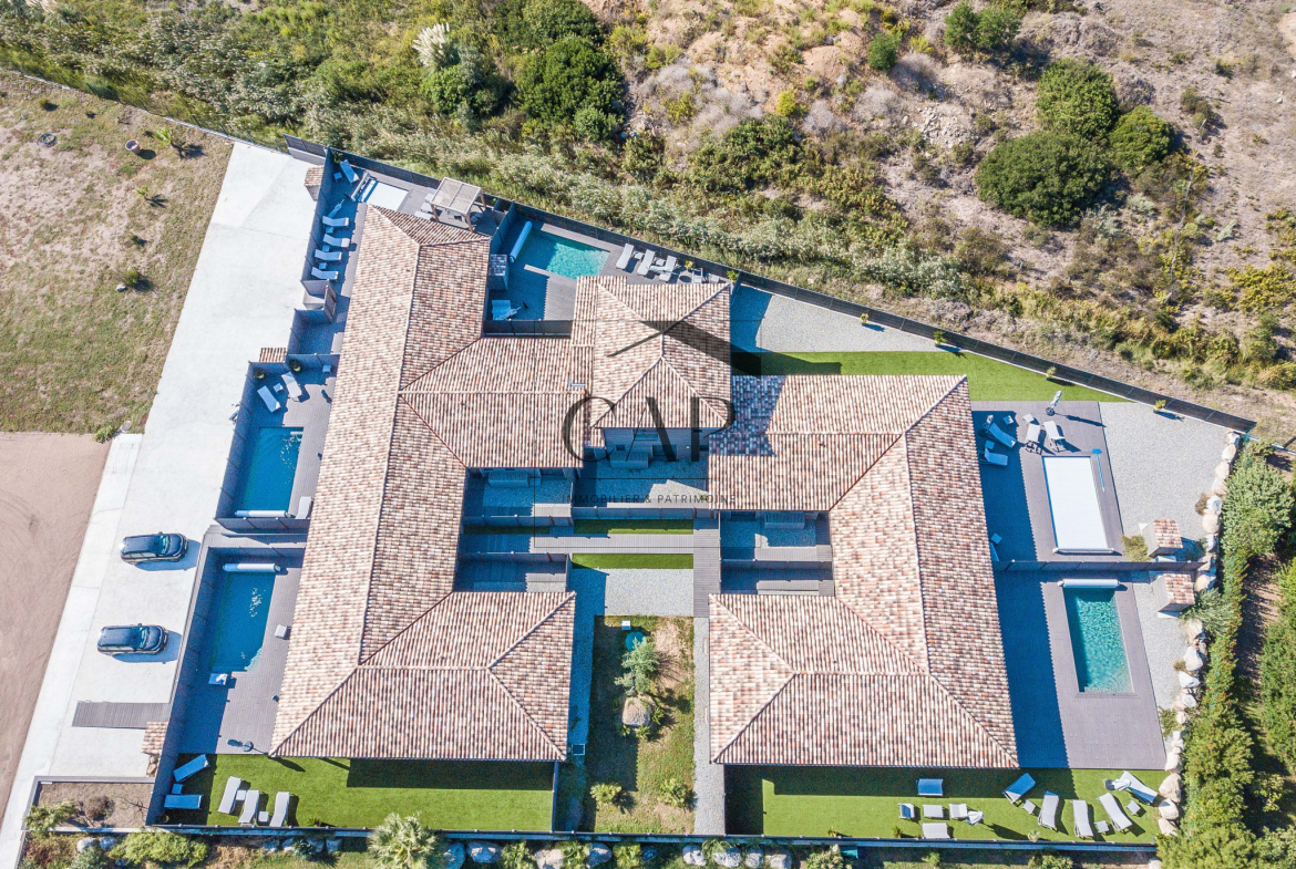— English version — Just steps from Cala Rossa beach, this exclusive estate features five luxury 4-bedroom villas, each with its own heated private pool. Offering 622 m2 of living space and over 1,000 m2 of terraces, the property includes 20 rooms, five bright living areas, and 15 ensuite bedrooms. Delivered furnished with high-end finishes, it is ideal for investors seeking a premium turnkey asset, only 10 minutes from Porto-Vecchio and 30 minutes from Figari airport.